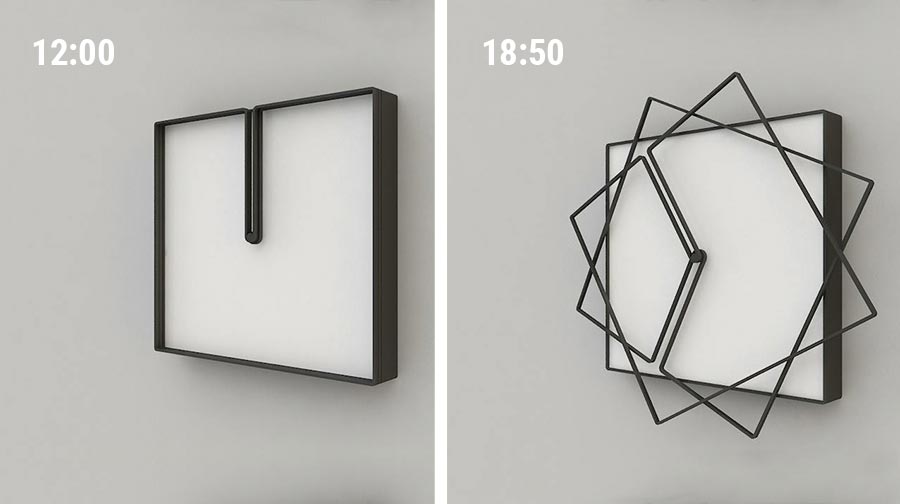 Der türkische Designer Nazar Sigaher hat 2009 dieses elegante Uhrendesign entworfen. Die „Frame Clock“ kommt mit beweglichen Rahmenteilen daher, die die Uhrzeit zwar auf den ersten Blick nicht wirklich leicht erkennbar sein lässt, dafür aber stets neue Formen annimmt – quasi im Minutentakt.