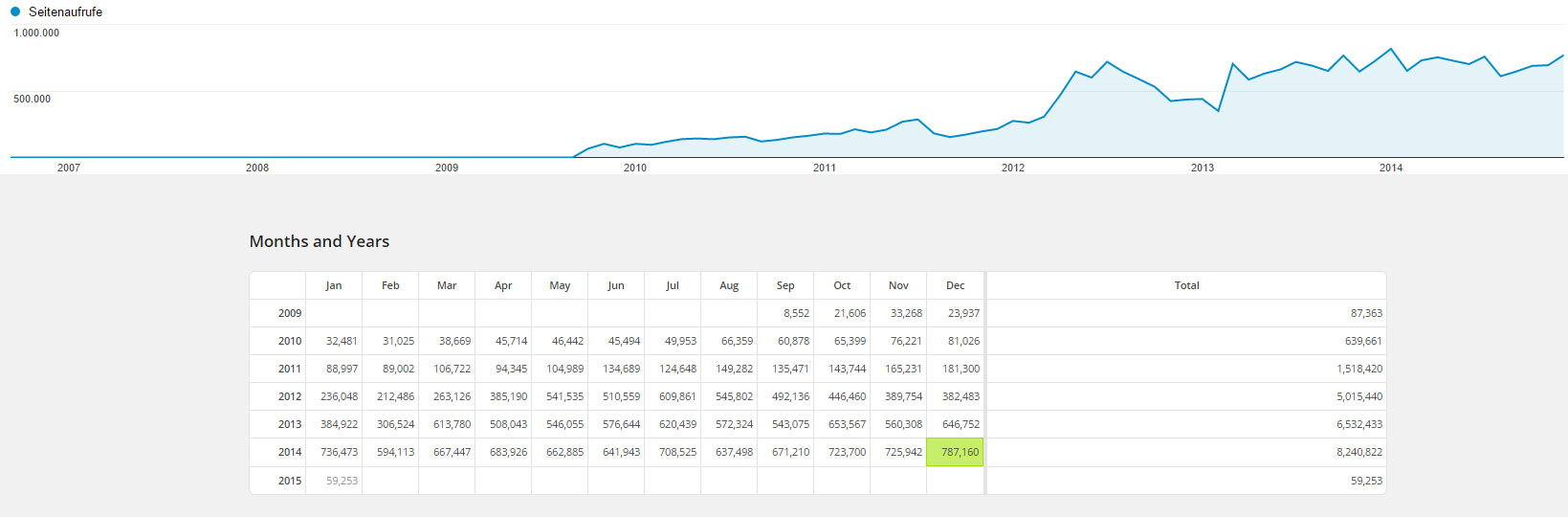 @San: Habe leider zu Beginn andere Dienste dafür genutzt, so dass ich für die ersten drei Jahre gar keine Daten habe. Richtig vergleichbar erst ab 2010. Hier findest du Google Analytics (oben) und WordPress (unten):
