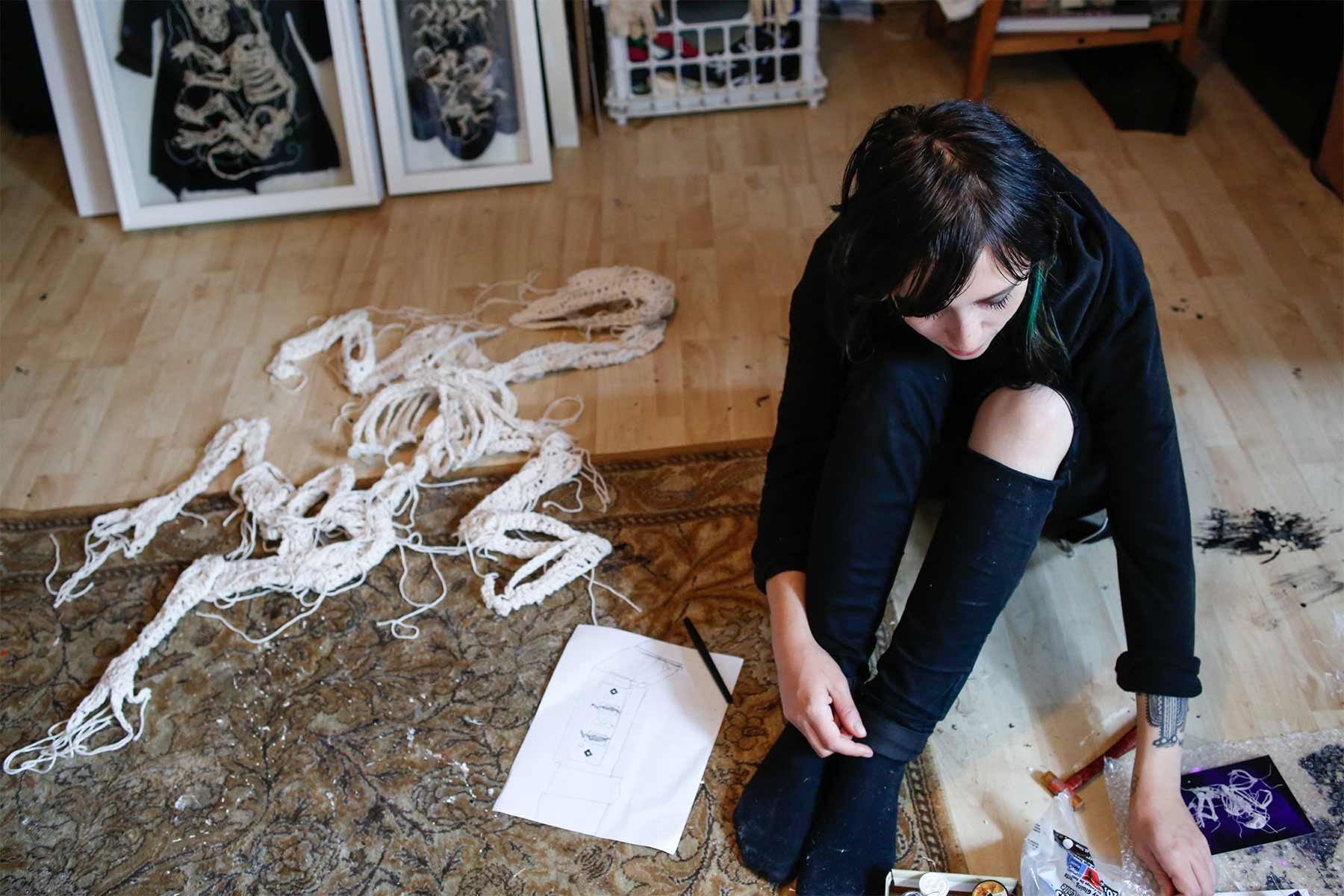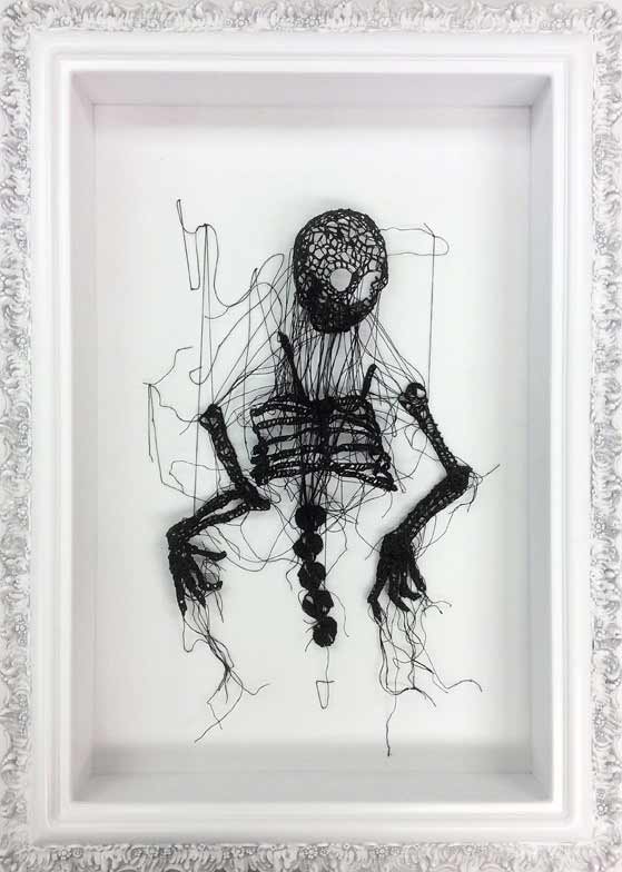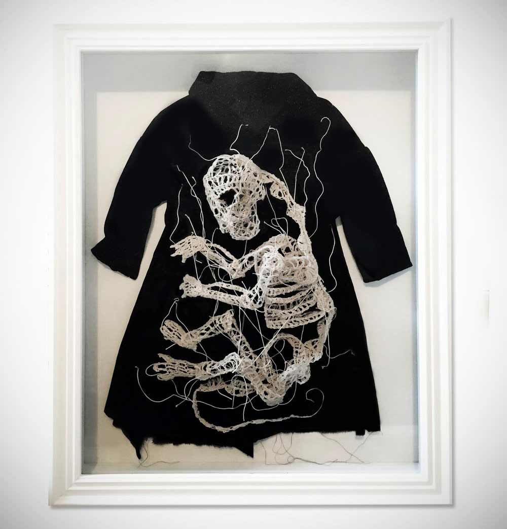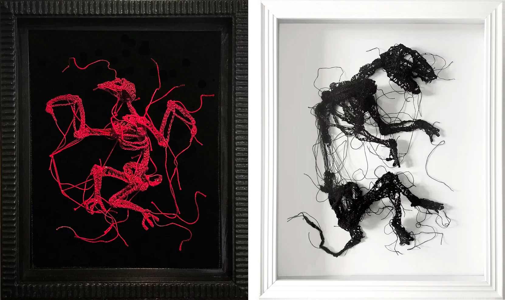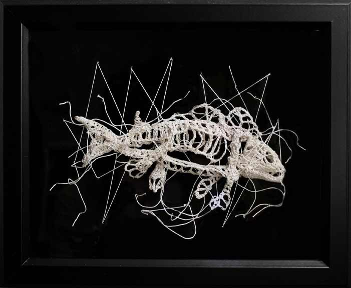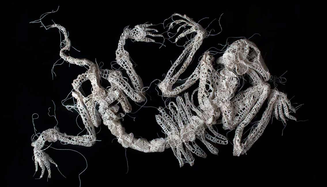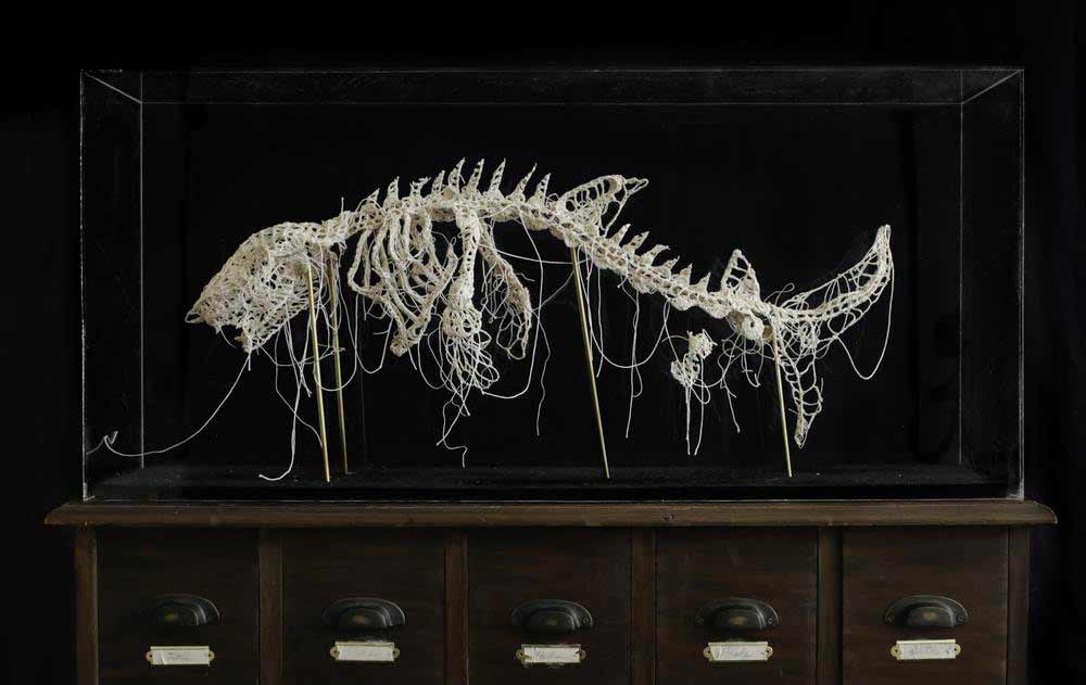 Eine sehr besondere Art des Häkelns liefert uns Caitlin McCormack mit ihren wollenen Tierskeletten. Gerade der Kontrast zwischen der eigentlich mit Knochen assoziierten harten Beständigkeit und der faserigen Weichheit der gesehenen Wolle, schaffen eine ganz besondere Wirkung beim Betrachten der Motive.