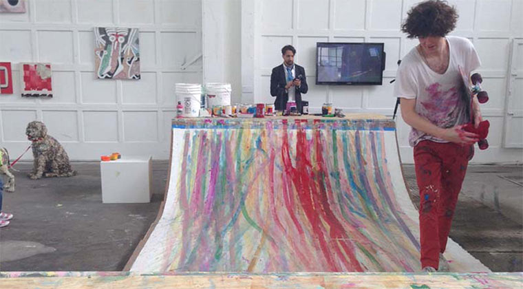 Kunst und Sport kriegt man recht selten in so einen direkten Zusammenhang, wie Matt Reilly es schafft. Der klemmt sich ein paar mit Farbe vollgesogene Schwämme unters Skateboard und fährt die Pipe auf und ab. Heraus kommen stilistisch zwar wenig abwechslungsreiche, aber durchaus ansehnliche Farbwerke, wobei jedoch vor allem der Entstehungsprozess selbst Unterhaltung verspricht. Coole Idee!
