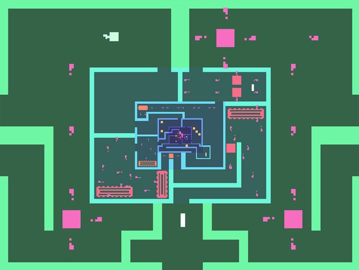 Als kleiner Pixelblock muss man seinen Weg durch verschiedene Eben des Spieles suchen. Ein bisschen Labyrinth-Charakter, hauptsächlich geht es jedoch schlichtweg darum, nicht zu sterben. Dabei kommt es schon einmal auf einen Pixel an. Letztlich zoomt man sich immer weiter in das Spiel hinein, zwischendurch wieder heraus, und muss letztlich versuchen, den Kern zu erreichen. Das „You Win“ hatte ich beim ersten Durchgang zwar bereits im Blick, geschafft habe ich es jedoch nicht auf Anhieb. Und genau das spricht für Fracuum, denn endlich ist es mal etwas fordernder und man muss von Vorne anfangen, wenn man mal verkackt. Toll!
