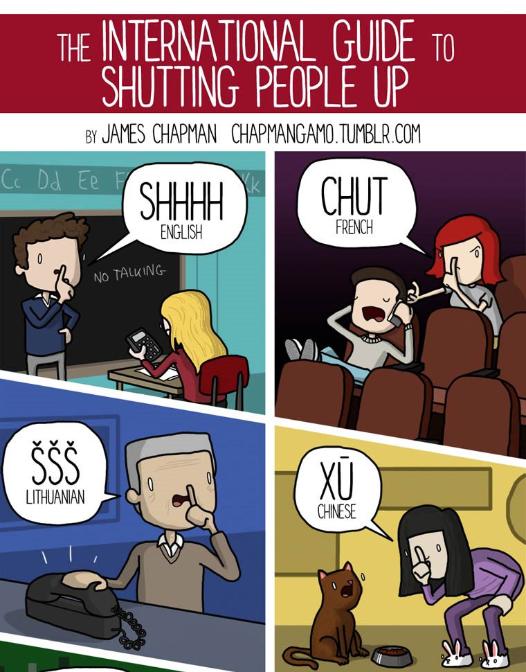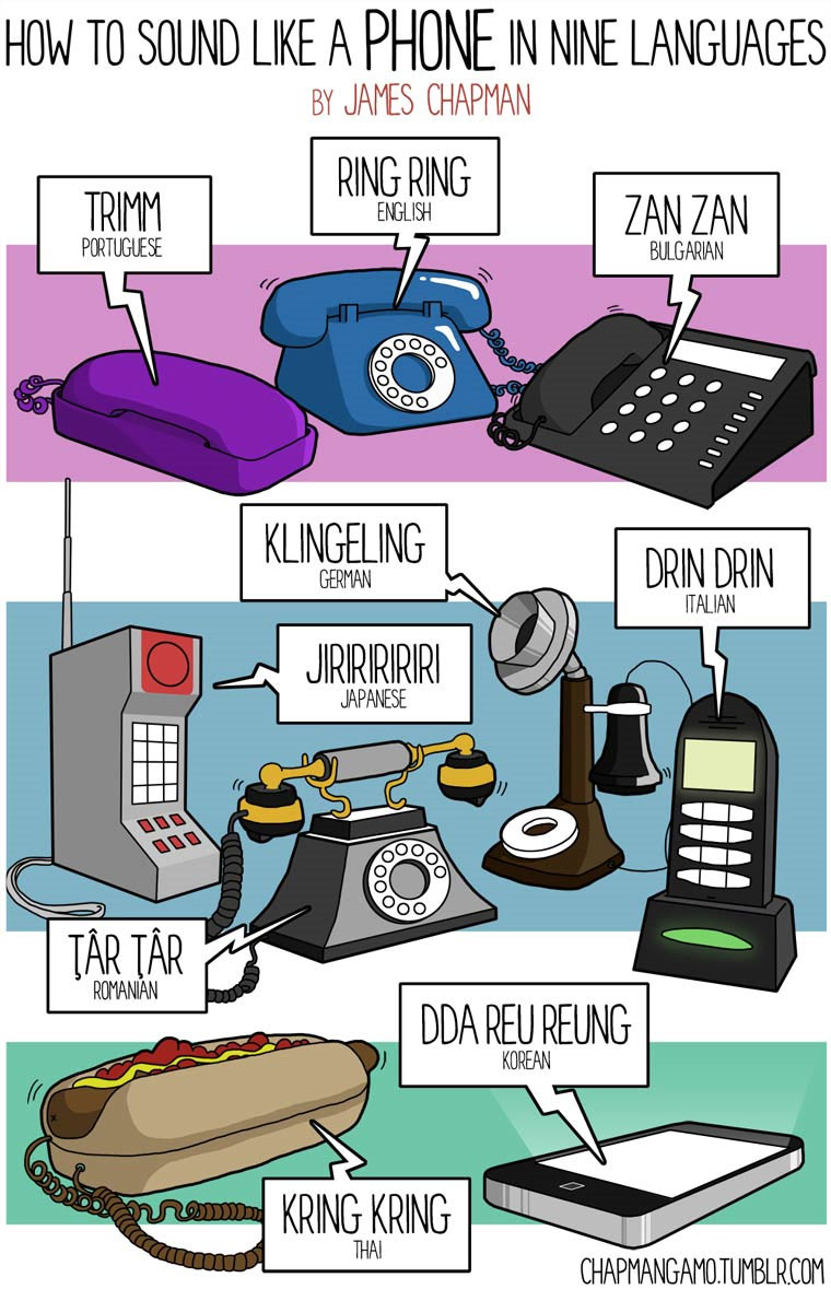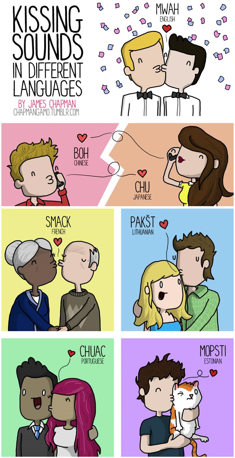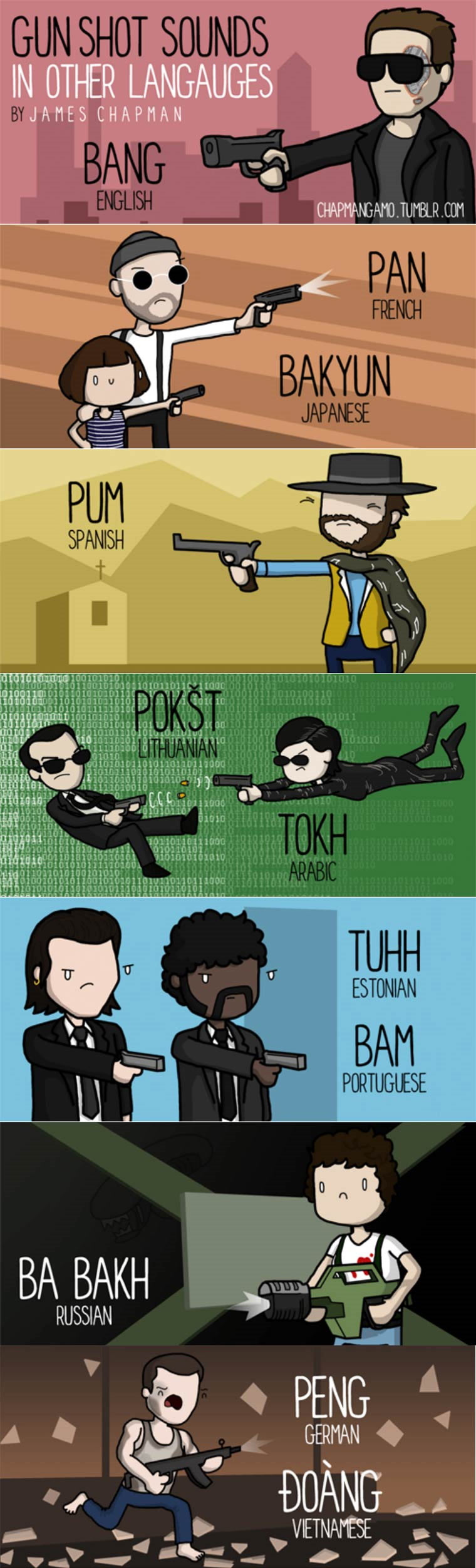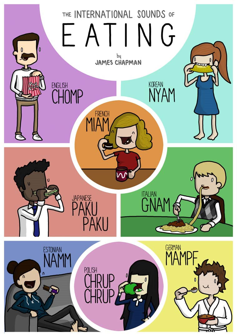 Eigentlich klingen Geräusche überall gleich auf der Welt. Und doch hat jede Sprache so seine eigenen Verschriftlichungen dieser, zum Beispiel in Comic-Strips. Illustrator James Chapman hat etliche dieser internationalen Wortlaute gesammelt und in eigens erstellten Comics gegenüber gestellt. Ob Essen, Schießen, Pupsen oder Schnarchen – wir alle tun es, aber es liest sich anders. Da sind schon einige erstaunliche Unterschiede zu entdecken.