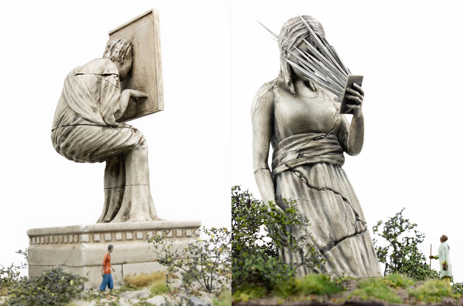 Thomas Doyle aus den USA hat sich auf die kunstvolle Darstellung von Miniatur-Settings spezialisiert. In seiner jüngsten Reihe „Clear History“ sehen sich die Miniaturfiguren (für sie) großen Statuen gegenüber, die im antiken Stil Figuren darstellen, die von moderner Technologie eingenommen worden sind. Ein gelungenes Stück Gesellschaftskritik.