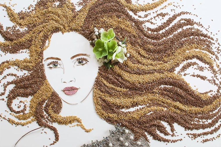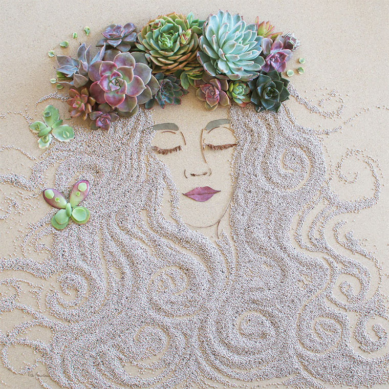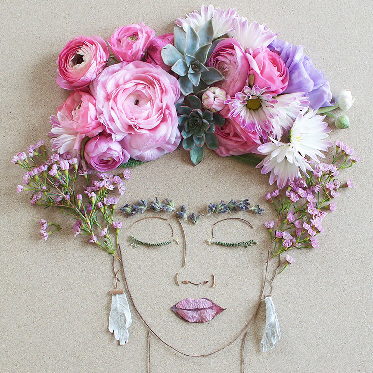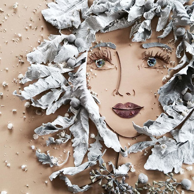 Vicki übernimmt im Mutter-Tochter-Duo SisterGolden nicht nur die Rolle der Mutter, sondern sammelt auch gerne „Dinge von Mutter Natur“, um daraus Portraits zu legen. Blätter, Blüten, Zweige – alles original und ohne weitere Beeinträchtigung verwendet. Das muss durchaus entspannend sein, die Gebilde in Ruhe derart anzuordnen und darauf zu hoffen, dass kein Windstoß durch die Bude fliegt.