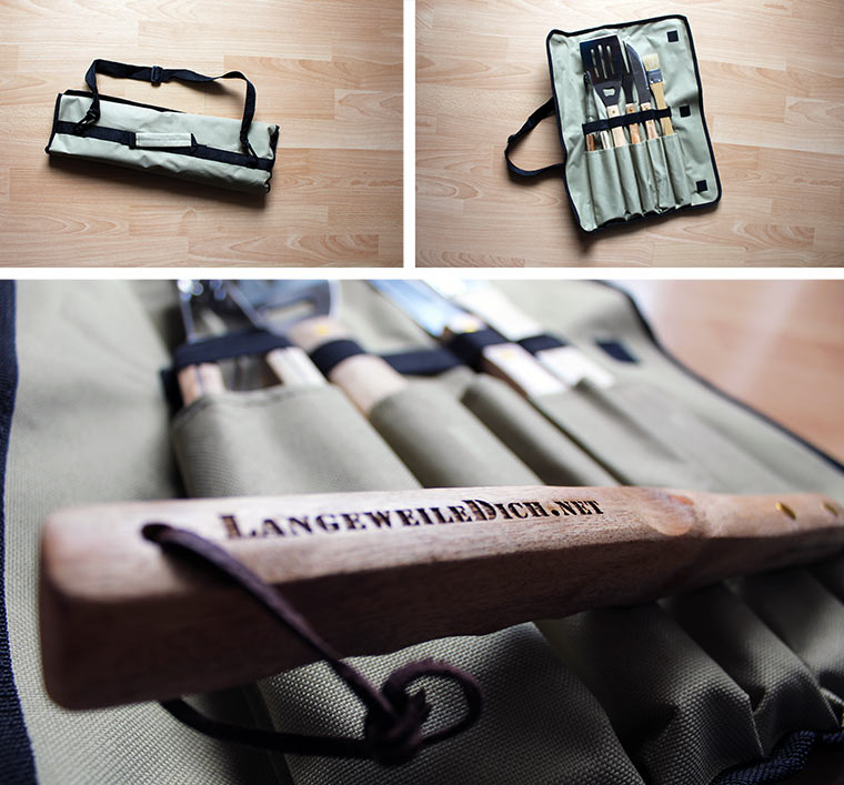 Zunächst hätten wir da das nötige Werkzeug für den Grillmeister. Das Premium-Grillbesteck besteht aus Grillzange, Wender, Pinsel, Messer und Gabel. Die einzelnen Bestecke sind jeweils mit einer persönlichen Wunschgravur versehen (Ja, bei mir hat sich ein weiteres „e“ eingeschlichen, das passiert bei euch natürlich nicht). Alles wird in einer praktischen Stofftasche geliefert, ideal zum Transportieren.