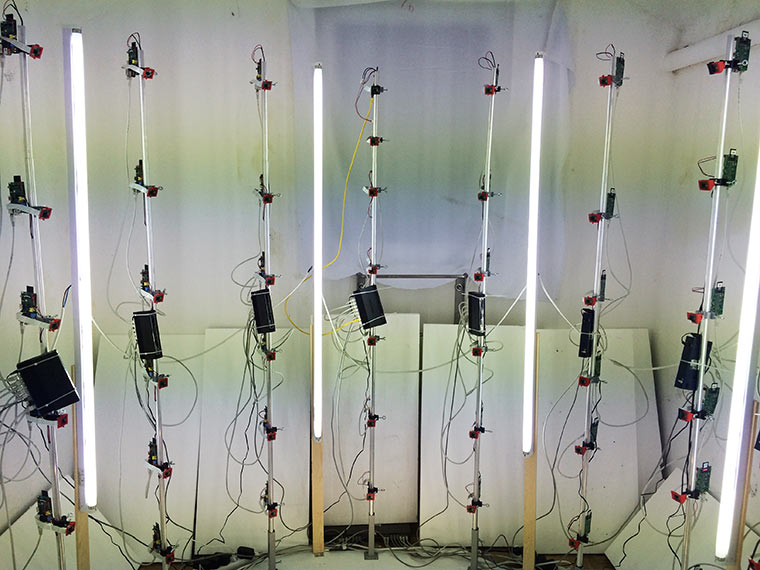 Bis zu zwei Meter groß kann man sein, damit die Ausrichtung der Kameras noch machbar sind. „Ein paar Zentimeter mehr hatte ich auch schon einmal hier drin, aber darüber wird es schwer,“ sagt Frank. Ich nehme Platz inmitten der Vorrichtung und überlege mir, wie ich mich hinstellen soll. „Ich habe schon einmal einen Testschuss gemacht, schaut gut aus,“ höre ich Frank am Laptop sagen. Das ging schnell. Tatsächlich ein Vorteil am Kamerasystem: ein einzelner Moment kann aufgenommen werden, theoretisch sogar binnen (nicht ganz so schneller) Bewegungen. Ein Sprung beispielsweise – nur kann die resultierende Figur dann nicht stehen, was ja auch irgendwie doof wäre.
