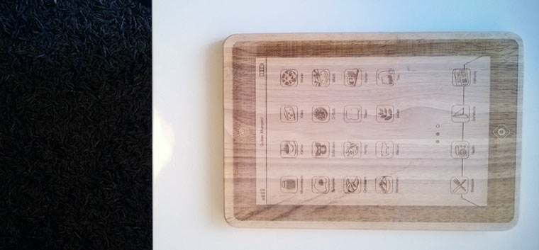 Hier ein Prachtstück. Das Frühstückspad hat nicht nur etliche Küchenapps auf dem Holzdisplay, sondern auch den eingravierten Wunschnamen auf der Rückseite. Stylisch, nützlich, gut.