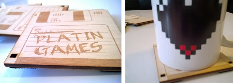 Die Holzdisketten-Untersetzer bringen Retro-Charme ins Wohnzimmer und schützen dazu den Tisch vor Kratzern. Win-win.