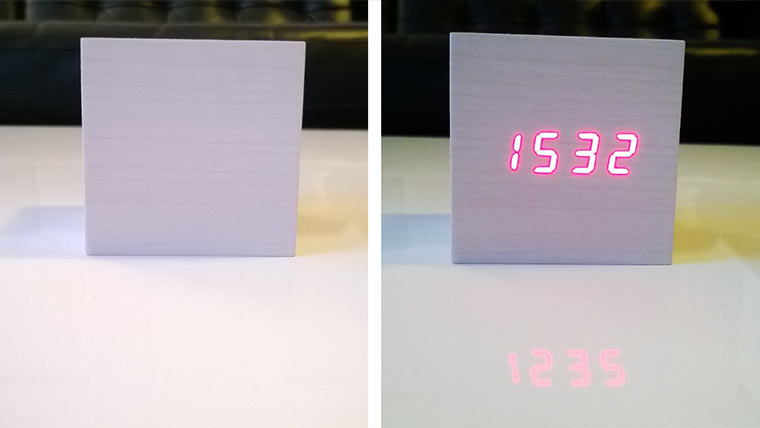 Die Holzuhr sieht zunächst aus wie ein kleiner Holzklotz. Ist die Uhr jedoch an, leuchtet die Uhrzeit auf.
