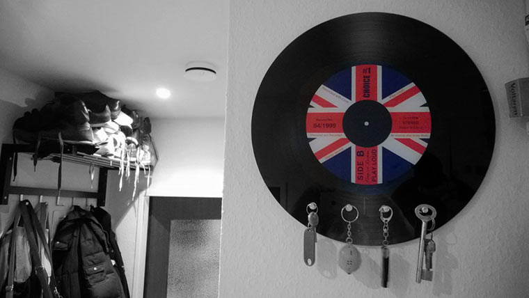 Und auch wenn es sich leider um keine echte handelt, die Schallplatte als Schlüsselbrett ist definitiv ein Hingucker.