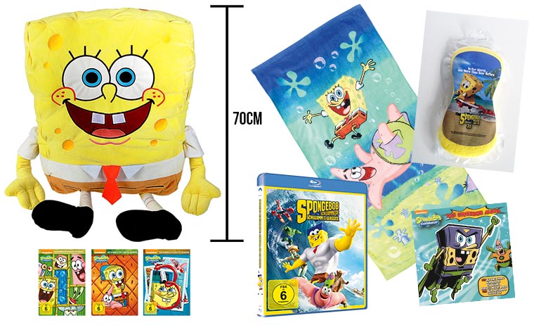 1 Hauptgewinn: Film auf Blu-ray, Plüsch SpongeBob (70cm), Staffel 1-3 (DVD), SpongeBob-CD, -Schwamm und -Handtuch