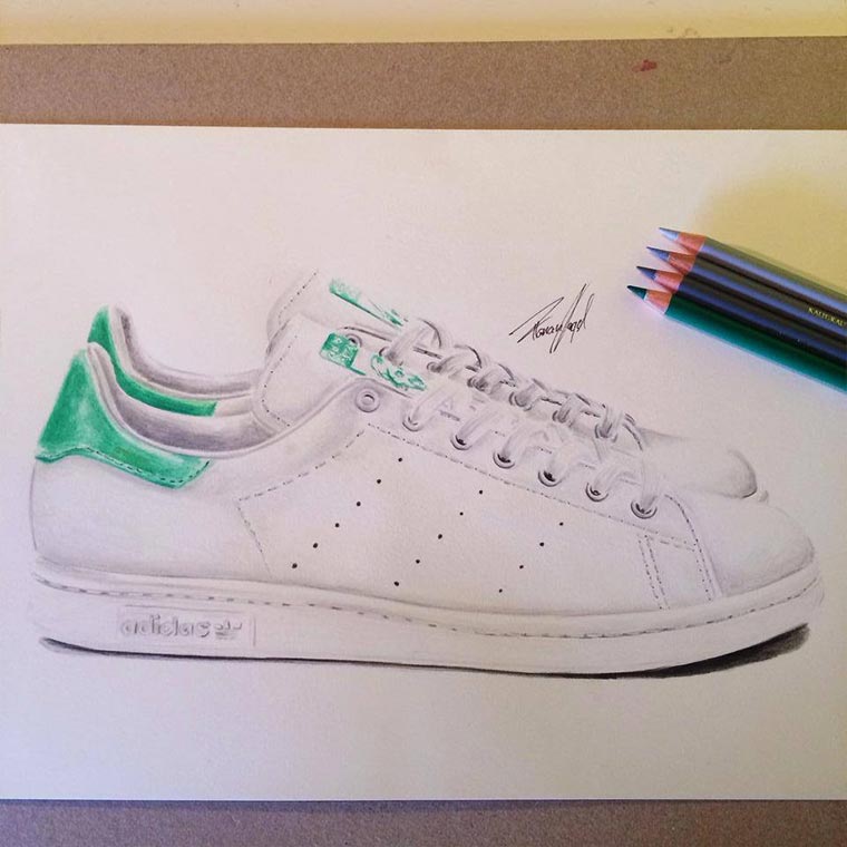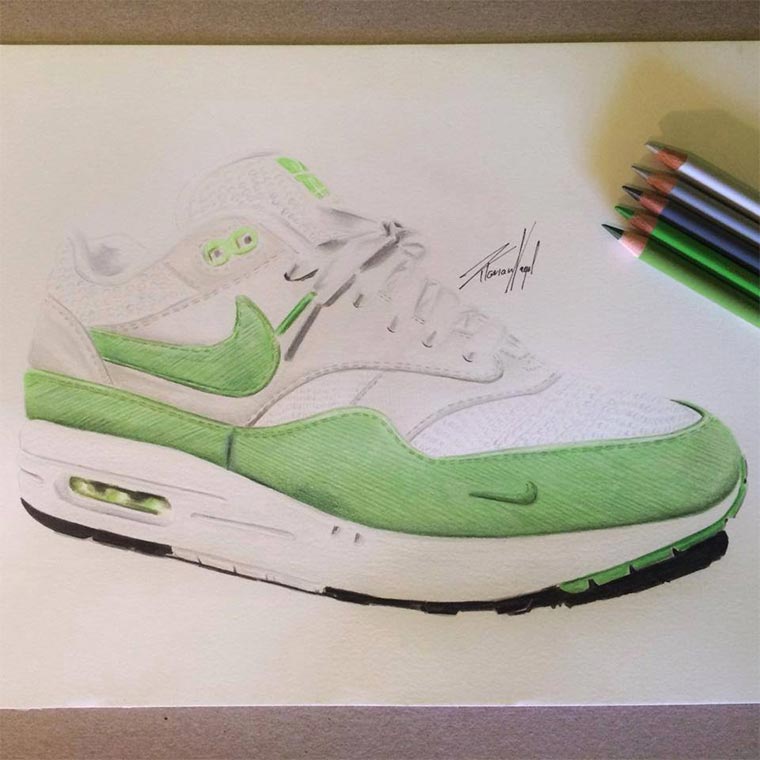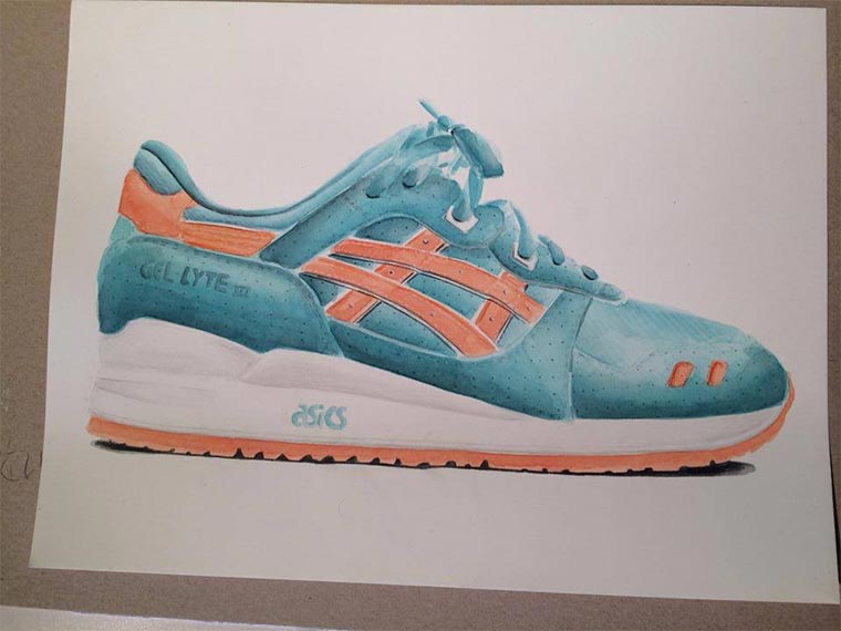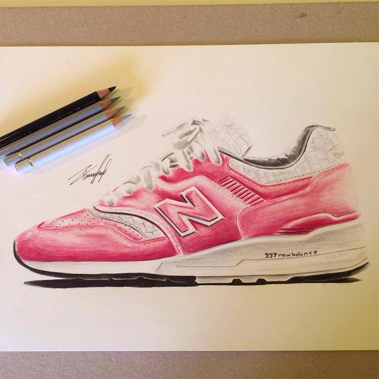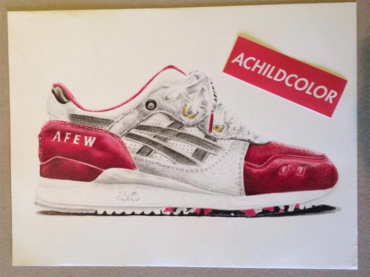 Letztens noch die Miniatur-Sneaker, jetzt die gezeichnete Variante. Zwar nicht ganz so eindrucksvoll, dafür deutlich platzsparender. Und immer in der richtigen Größe parat. Denn genau das Problem hatte der angehende Kommunikationsdesigner Florian Nagel aka achildcolor, als er seiner Freundin zum Valentinstag ein echtes Paar schenken wollte. Gab es nicht, also wurde kurzerhand eine möglichst realistisch aussehende Zeichnung geschaffen. Und der Startpunkt für viele weitere…