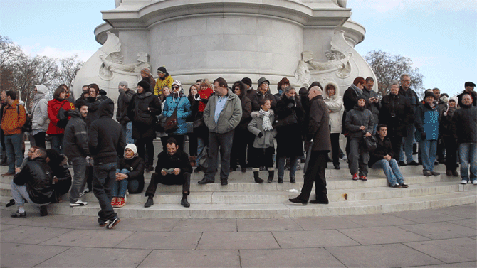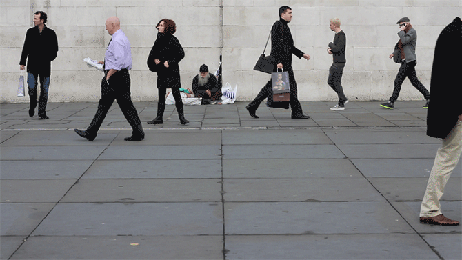 Das Prinzip hinter den Bildern von ist simpel: Ein Foto mit einer Reihe Menschen, alle stillstehend, nur eine Person bewegt sich. Moderne GIF-Animationskunst, die subtil den Moment festzuhalten scheint, indem die eine Person alles um sich herum einfrieren lässt um sich selbst in den Focus zu bewegen.