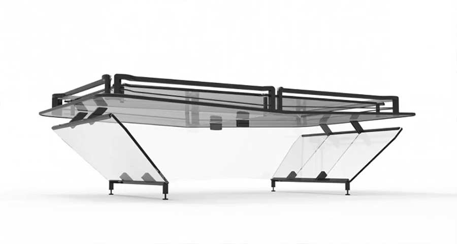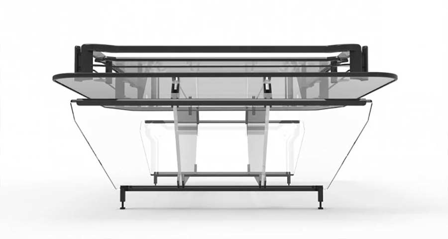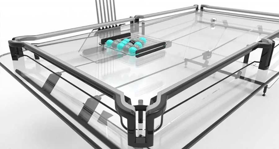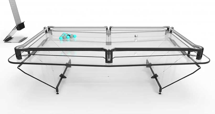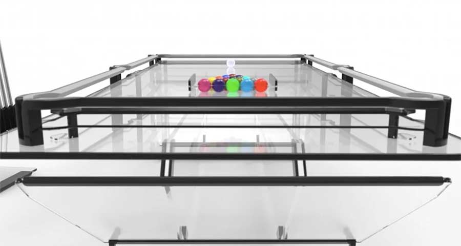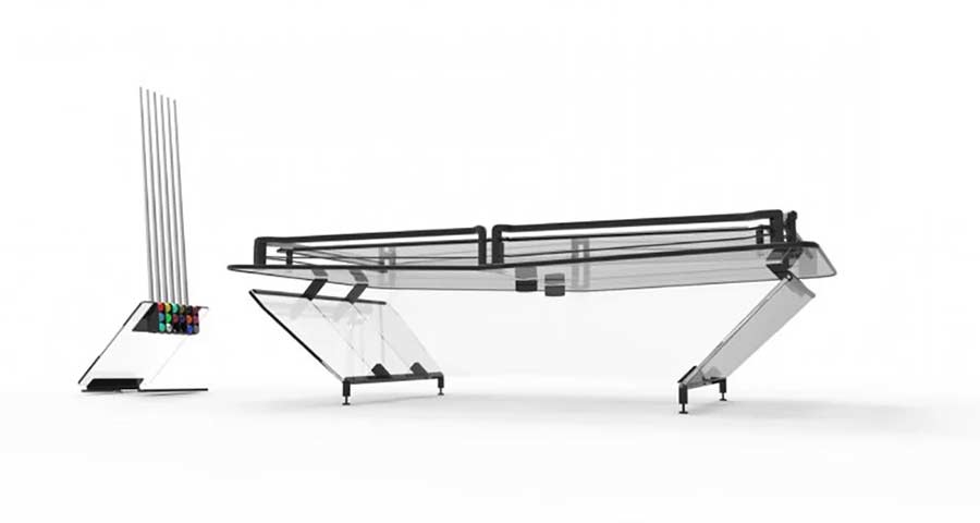 „Unlike anything the world has seen before, this table introduces a concept that has the potential to start a new generation of modern pool tables – both in glass and slate – that will once again change the definition of ‘ultra-modern’. The transparent playing area is composed of the patented Vitrik transparent playing surface. This surface replicates the rolling resistance of felt and provides a shock absorbing layer for the glass beneath.“