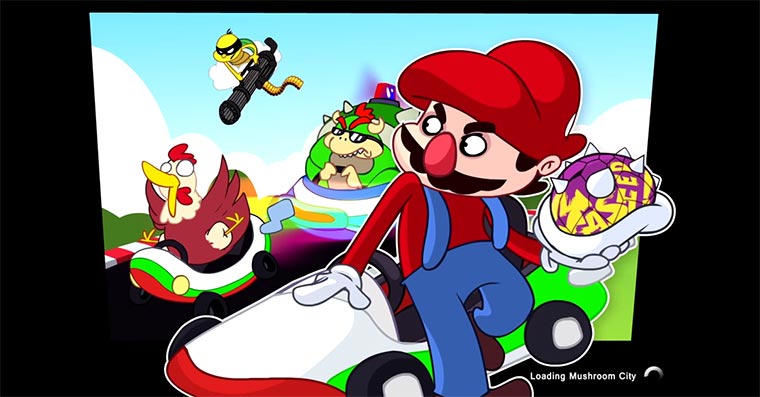 „Mario freaks out on a mushroom fuelled, explosive joy ride through Mushroom City.“