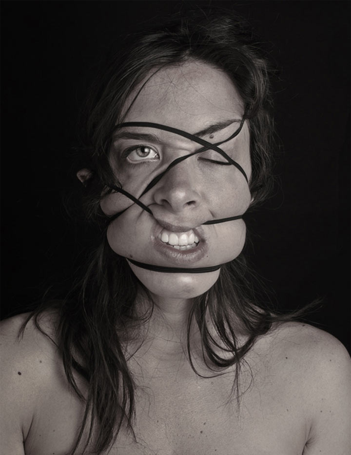 Sehr skurriles Projekt der spanischen Fotografin Natalia Pereira. In ihrer Serie Dismorfobina zeigt sie uns Portraits von Menschen, die ihre Gesichter mit massiven Gummibändern entstellt haben. Sieht lustig aus, hat aber einen ernsten Hintergrund. Die Reihe ist nämlich an die Krankheit Dysmorphophobie angelehnt, einer „Störung der Wahrnehmung des eigenen Leibes“.