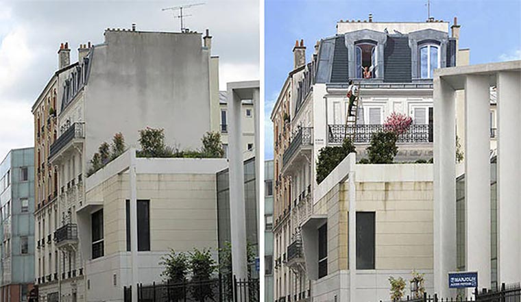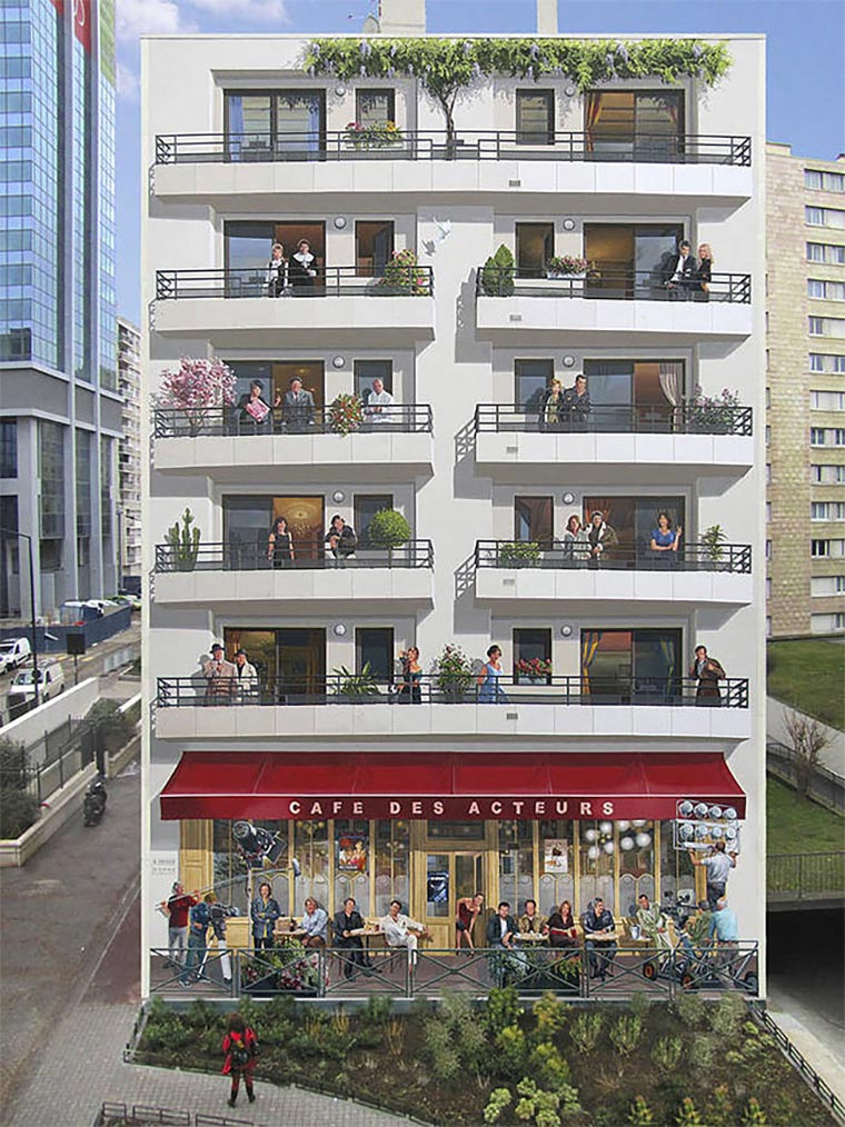 Patrick Commecy malt Hauswände an Hauswände. Was komisch klingt, ist eine tolle Art der Verschönerung von Gebäuden. Statt trist-grauer Seitenwand zeigen sich dem Betrachter nun lebendige Balkon-Landschaften und Ausblicke. Tolle Ideen dabei und vor allem gelungen integrierte Umsetzungen, toll!