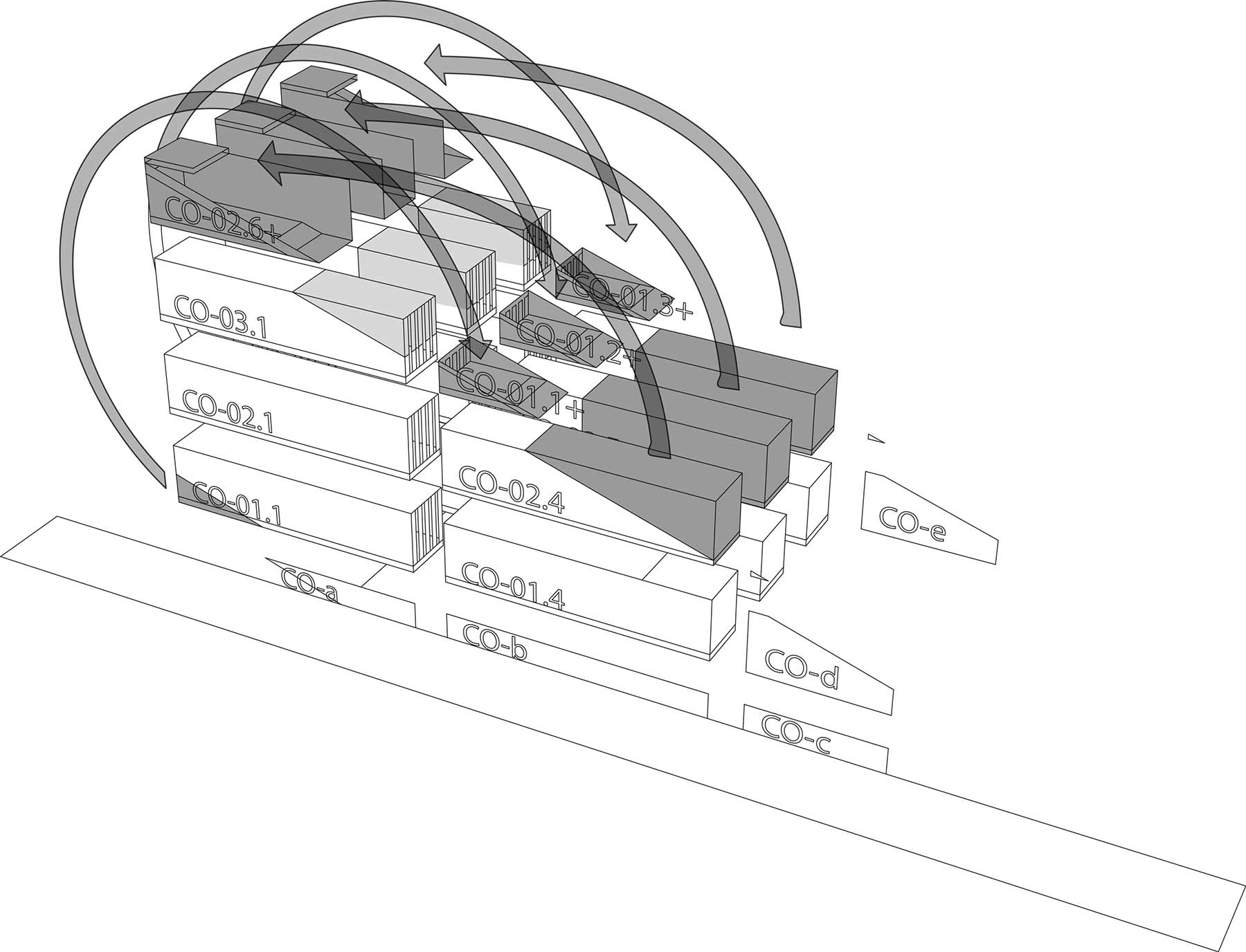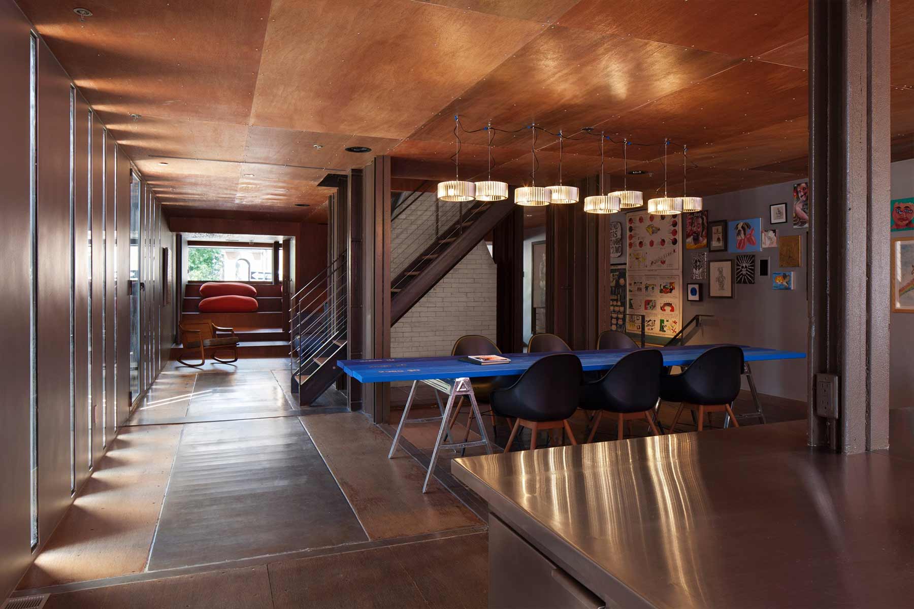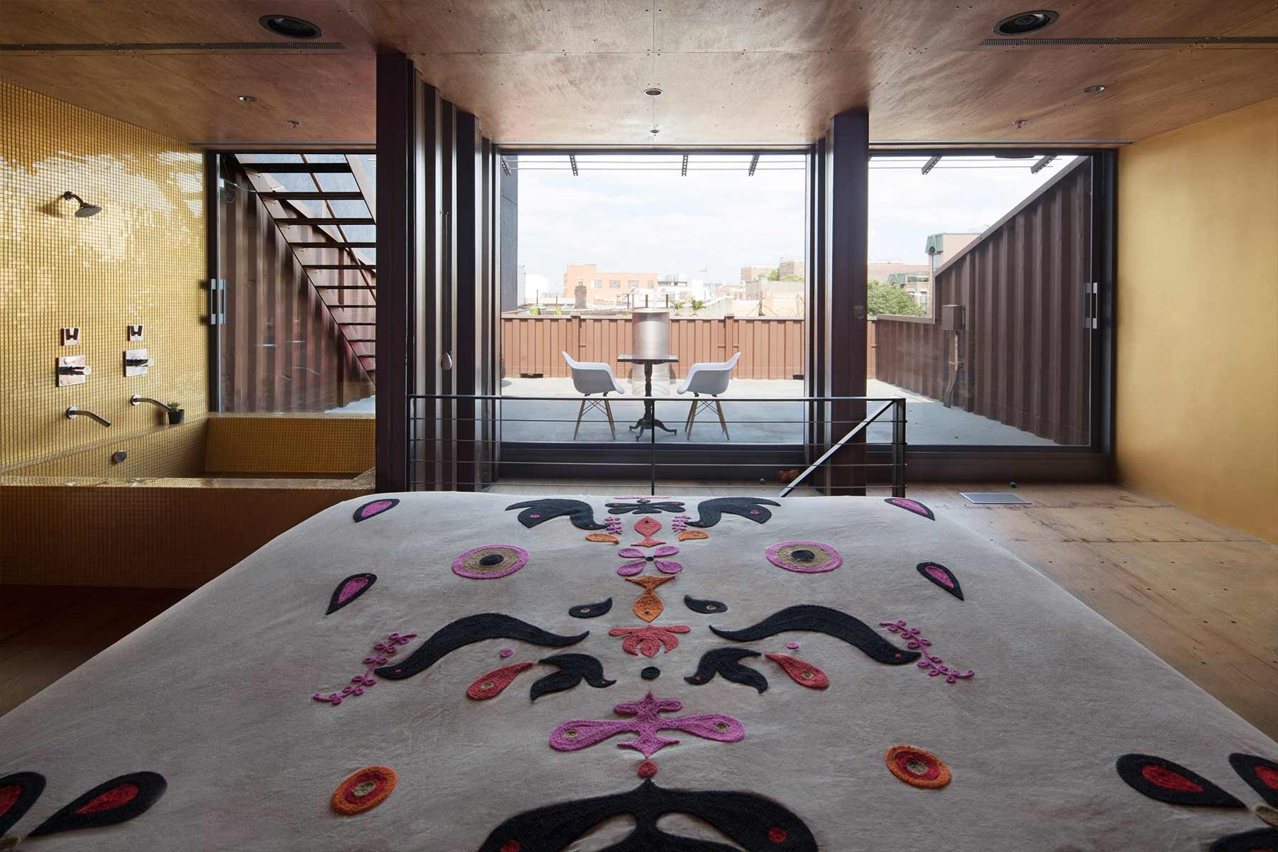 „Transforming the containers’ assembly into a single-family residence, the diagonal cut generates a very enclosed and private monolith from the surrounding streets. The diagonal also modifies the conventional ground-floor rear yard type and use, allocating private outdoor space at each level of the house. Large glass doors allow access to each deck, offering light and cross ventilation at all levels. A steel stair along the north wall connects all outdoor spaces.“