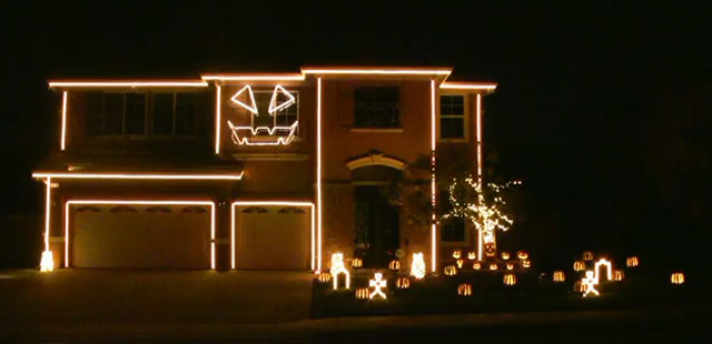 In Amerika scheint es das Studienfach Hausbeleuchtung zu geben, anders ist nicht zu erklären, dass die für alles und jede Gelegenheit ihre Häuser mit möglichst vielen Birnen verzieren. Kommen aber teile auch sehr kreative Dinge bei rum. So wie bei diesem Halloween-Haus.