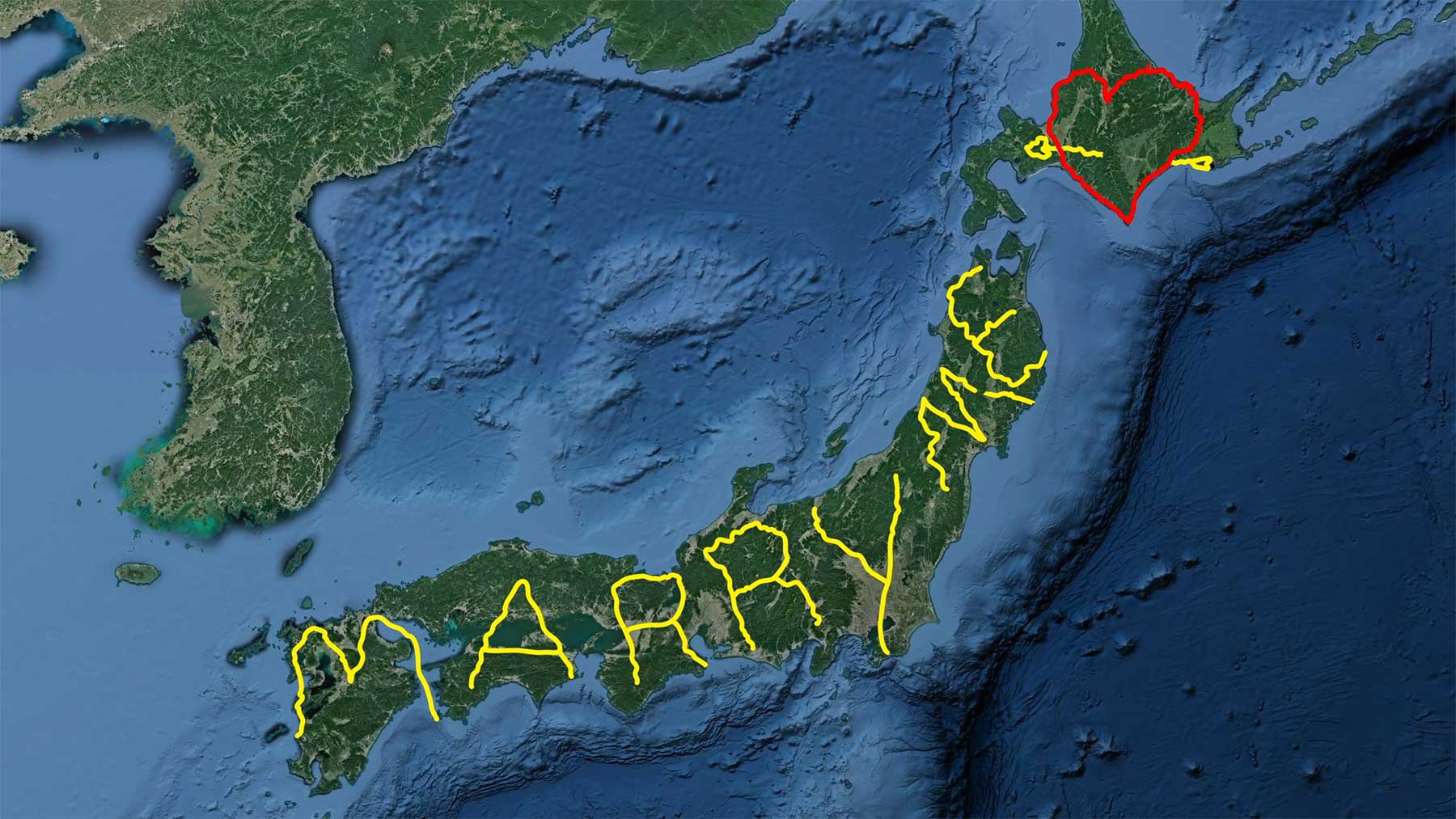 Das erinnert ein bisschen an die GPS-Kunstwerke von Stephen Lund, statt mit dem Fahrrad erläuft Yasushi Takahashi aka Yassan seine Motive jedoch. Das persönlich wie räumlich größte Exemplar hat der japanische Künstler „einfach mal“ quer über Japan gemalt: einen Hochzeitsantrag an seine damalige Freundin. Mit dem 7,163.67 km langen Schriftzug ist er im Jahr 2010 ins Guinness-Buch der Weltrekorde gekommen!