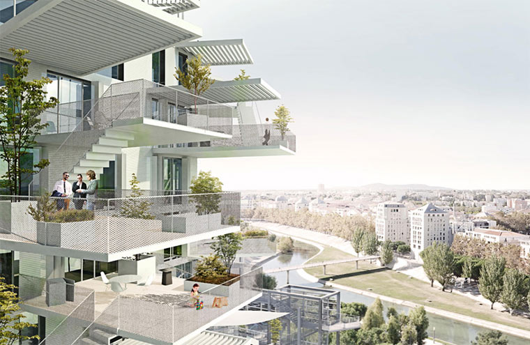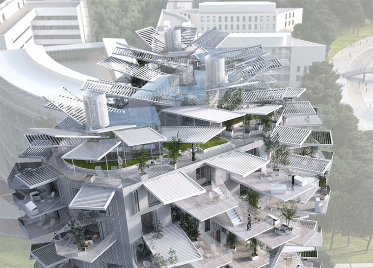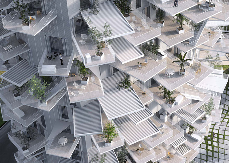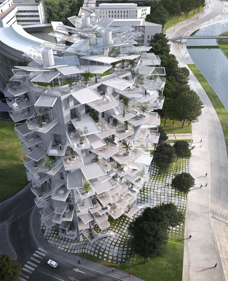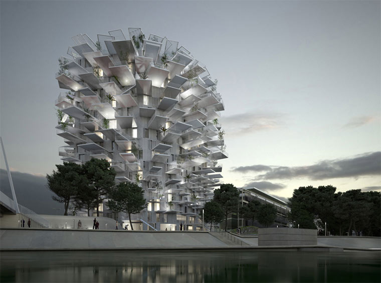 In Montpellier stellen die Architektengruppierungen Sou Fujimoto Architects, Nicolas Laisné Associés und OXO Architects den Richter Tower auf, auch White Tree genannt. Die verstreuten Balkonenden sollen an eine Baumkrone erinnern. Und auch wenn eine stammartige Basis aus Statik- und Sinngründen fehlt, ist das Gebilde durchaus besonders anzuschauen. Und jeder hat einen Balkon – auch wenn die Größen und Ausrichtungsunterschiede vielfältiger kaum sein könnten…