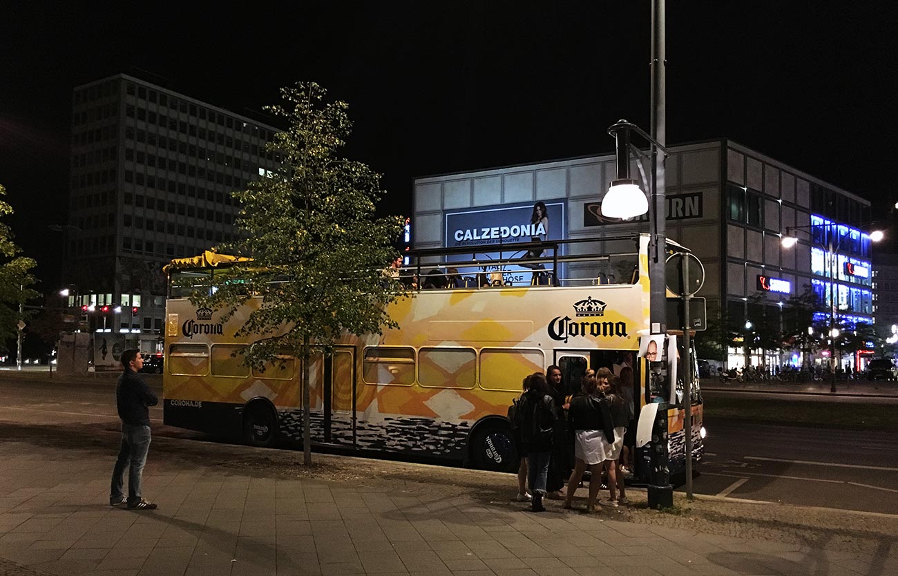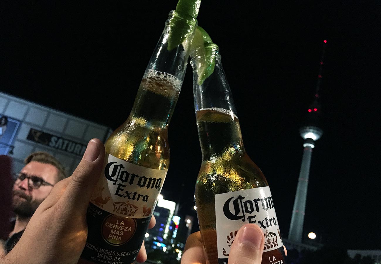 Neben Lounge-Musik-DJ, Burgern und natürlich dem einen oder anderen Corona Extra gab es auch einen gebrandeten Doppeldeckerbus, mit dem wir nachts noch eine Tour durch Berlin gemacht haben. Das hat schon verdammt viel Laune gemacht und dürfte vermutlich das tägliche Erlebnis eines Bürgers Mexikos 1:1 wiederspiegeln. Die fahren bestimmt stündlich Doppeldecker und genießen den Fahrtwind.