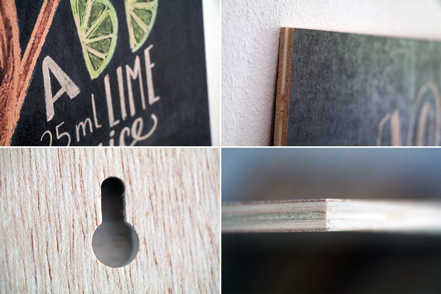 Aber kommen wir zum Wichtigsten: Wie schaut es denn nun aus? An sich bin ich sehr zufrieden. Die Holzmaserung gibt dem Bild tatsächlich mehr Struktur, es wirkt nicht so „rein“ und „langweilig“, wie manch andere Bilder, die auf Forex oder Alu-Dibond gedruckt werden. Die schauen dann vielleicht edler aus, bei aber allgemein eher Vintage-artigen Motiven wirkt das Holz sehr gut. Einzig muss man darauf achten, dass man nicht zu viel Weißraum hat – oder aber mit den Verfärbungen leben kann. Bereits hier sieht man, dass die eigentlich hellgrauen Kreidestriche etwas bräunlich ausschauen. Das ist, weil bei zweiter Weiß-Lage die Maserung des Holzes nicht mehr zu sehen ist. Geschmackssache, ich hätte das „richtige“ Weiß lieber gehabt. Dennoch sind wir mit dem Resultat zufrieden.