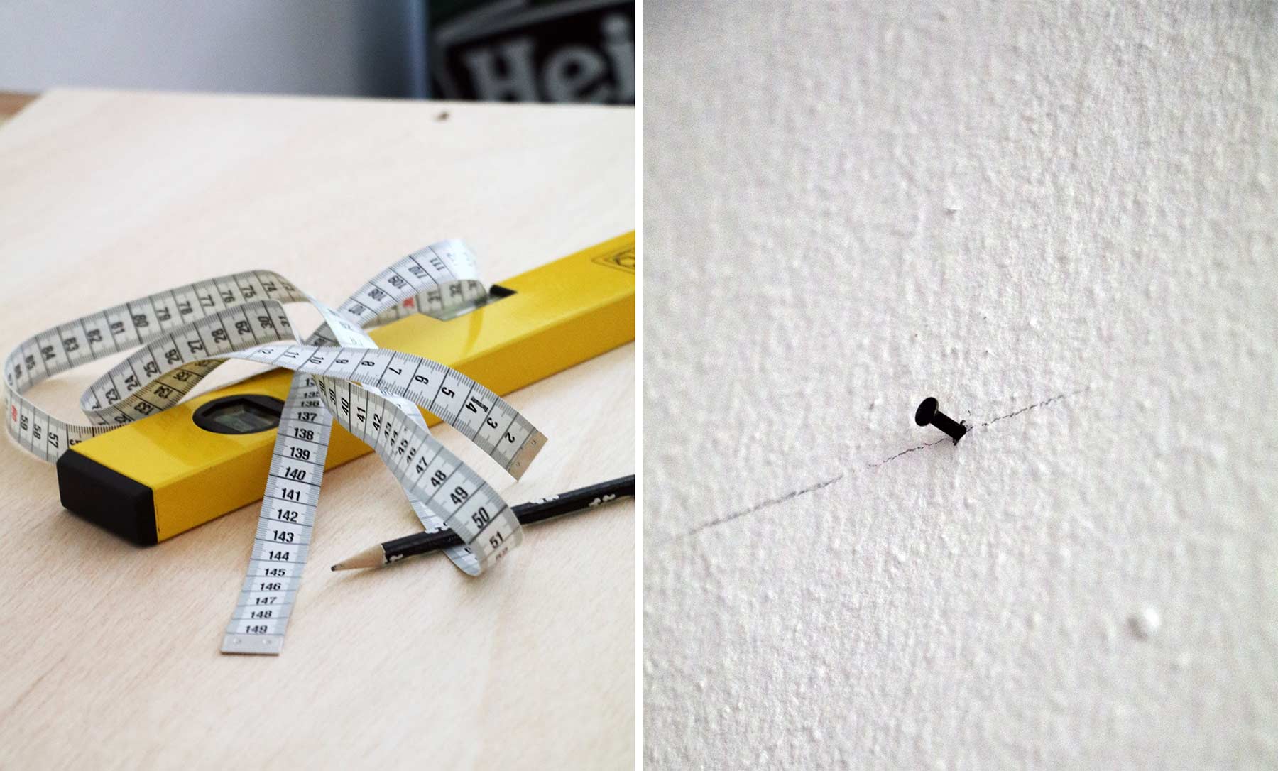 Das finde ich tatsächlich sehr smart gemacht: Anstelle sonst üblicher Sondermaterialien, die an die Rückseite der Bildplatten angebracht werden müssen, sind bereits Löcher zum Aufhängen in das Holz gefräßt. So braucht man nur noch ein wenig messen, in Waage setzen, markieren und nageln – fertsch! Das haptische „Suchen“ der Löcher hat beim Anbringen etwas gedauert, aber binnen weniger Minuten hing das gute Stück auch schon.