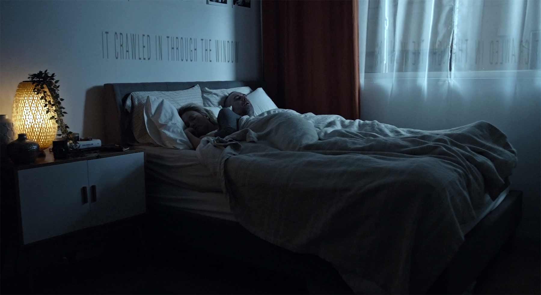 „There’s something that fascinates me about the concept of spending such a considerable portion of our lives searching for someone to share a bed with. I’m an intensely light sleeper, so there’s an interesting paradox in feeling a sense of love, security, and comfort while getting the worst sleep of my life when sleeping next to someone. I’ve had a few partners chastise me for my dark imagination, and I don’t blame them. I spend a lot of my professional life thinking up and searching for scary things, but it wasn’t until I was drifting off and was interrupted by a partner swearing she saw someone outside the window that I understood how unnerving it can be to be. It got me thinking that what scared me wasn’t that there might be someone out the window, it’s that someone I shared a bed with, someone I loved, was afraid. In the end, there wasn’t anyone there, and we laughed off our jitters, but that feeling stuck with me. I’ve worked with Nicole Starrett for a few years now and trusted that she would do this feeling justice, and I couldn’t have been more grateful for her to bring in Mark Cosby, a brilliant actor who she had worked with before and trusted with the kind of fear they would be sharing. ‚I hate being scared,‘ Nicole admitted, ‚I really do.‘ It showed, and it was perfect.“
