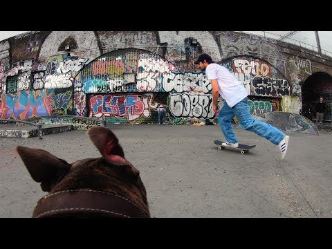 Etwa seit Anbeginn des Skateboard-Sports galt auch immer die Frage, wie man ihn denn möglichst cool filmisch in Szene setzt. Gerade die Dynamik des schnellen Sports einzufangen, ist nicht immer einfach, oftmals wird dabei auf die Hinter-/Nebenher-Kamerafahrt eines weiteren Riders gesetzt, der auf dem eigenen Brett Geschwindigkeit und Bildstabilität halten soll. Aber wozu der ganze Aufwand, wenn man dank modernster digitaler Bildstabilisierungen nicht auch einfach einen Hund hinterherhetzen kann? Das ist auch gleich viel charmanter und interessanter!