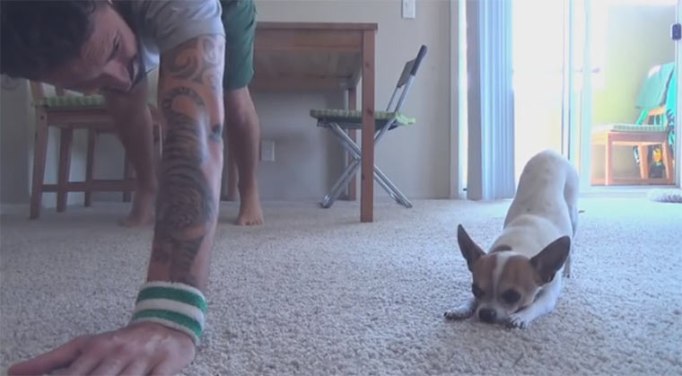 Das nenne ich Verbundenheit! Anstatt das Herrchen die ganze Zeit anzukläffen, während der Sonnengruß & Co. praktiziert, anstatt mit dem Hund raus zu gehen oder Bälle zu werfen, macht der Vierbeiner einfach mit. Und hat damit bereits mehr Joga in seinem Leben gemacht als ich…