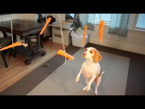 Simple Idee, tolle Wirkung. Einfach ein paar Karotten an den Deckenventilator binden und schon ist der Hund für eine ganze Weile beschäftigt. Und man selbst als Zuschauer bestens unterhalten. Eine Win-Win-Situation. Und Möhren sind ja eh total gesund. Also ab dafür!