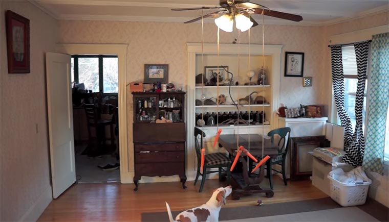 „Cute dog Maymo loves carrots, so he is extremely excited when he walks into the dining room to find 5 carrots swinging from the ceiling fan.“