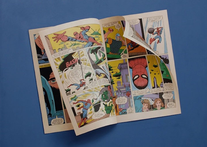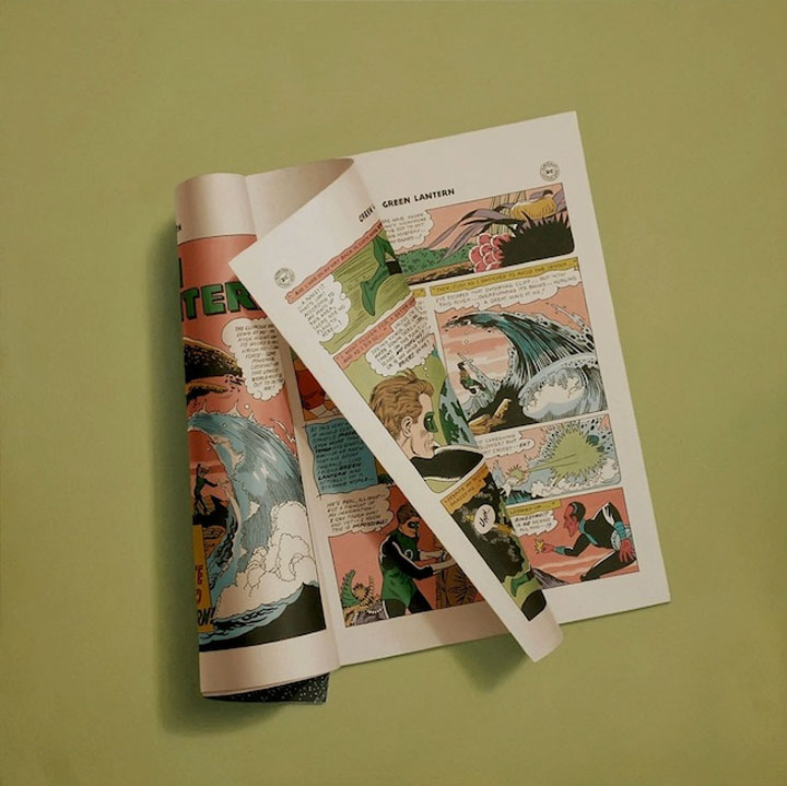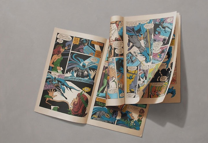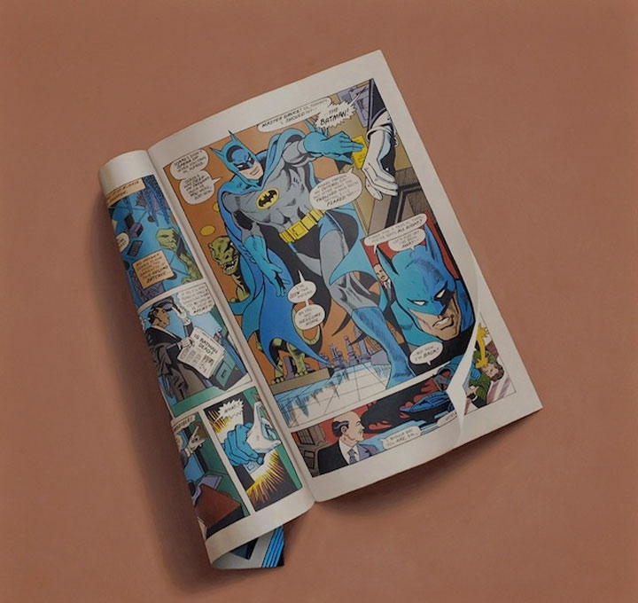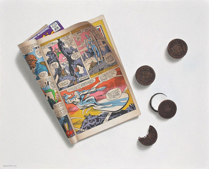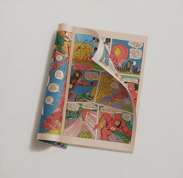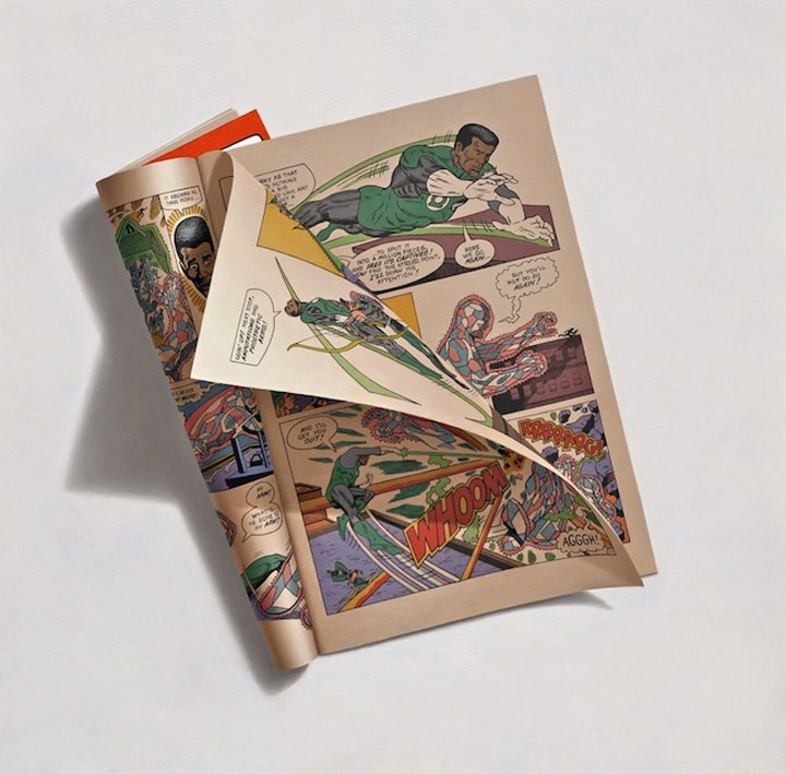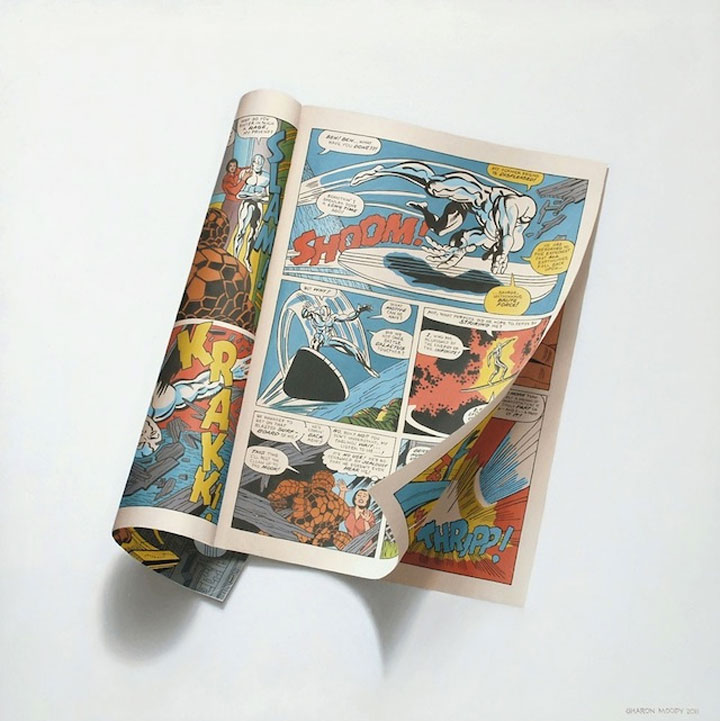 Das ist ja mal sowas von krass. Künstlerin Sharon Moody aus Washington malt(!) Comicbüchern, die auf Tischen liegen. In der Regel natürlich im umgeschlagener Seite oder sonstigem neumodischen Schnickschnack, damit es nicht ganz so einfach ist. Heraus kommen total langweilige Fotografien von offenen Comicbüchern auf Tischen. Oder aber extrem grandiose hyperrealistische Gemälde. Ich entscheide mich für Letzteres, auch wenn Ersteres wohl das größere Kompliment ist. Toll sind auch die Bezeichnungen ihrer Werke. Da heißt schon einmal eines „Zit! Throom! Krrakkk!, oil on panel, 16X16 in“.