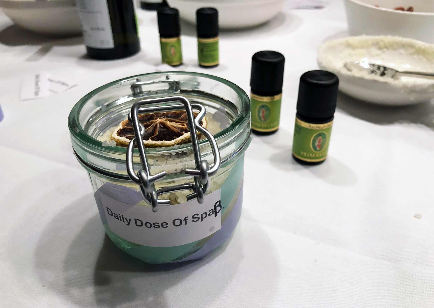 Nachdem wir noch gezeigt bekommen haben, wie man ganz leicht sein eigenes Salz-Peeling erstellen kann, gab es einige Snacks und etwas Zeit, sich auszutauschen. Bis dahin hatten wir pro Station auch einige willkommene Durchschnauf-Entspannungs-Tipps für Zuhause erhalten, die dabei helfen sollen, im stressigen Alltag mal etwas abzuschalten, wenn gerade mal nicht das Massage-Team im Nebenraum wartet. Das macht man ja eh viel zu selten (also, Durchschnaufen, nicht im Nebenraum warten…). Zum Beispiel eine „Offline-Sitzung“ (also mal ohne Smartphone aufs Klo) oder Oflege-Tipps, wie diesen: