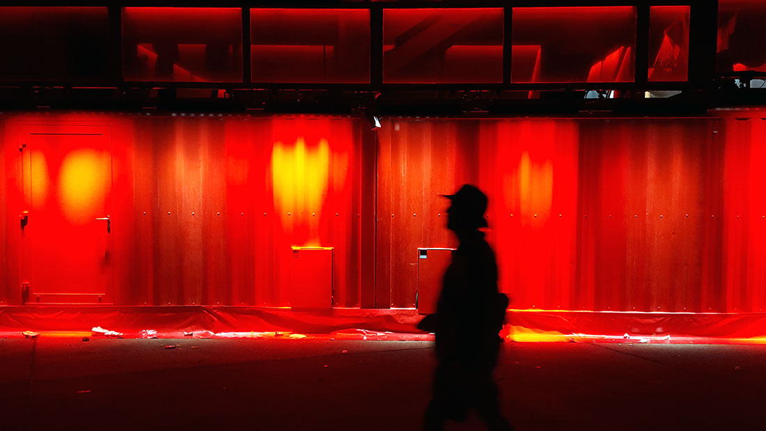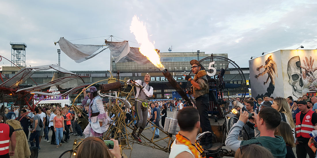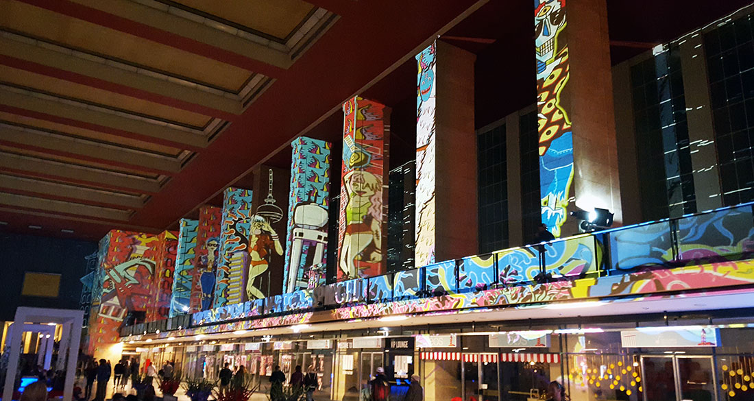 Noch geiler waren da eigentlich nur noch die Projektionen, die spät abends hochgefahren worden sind. Zum Beispiel in der Flughafenhalle, vor allem aber an der Frontfassade selbst (s. allererstes Bild im Beitrag). Man merkt, hier hat man sich viele Gedanken um die Details gemacht und alles war eine große Show. Plötzlich fahren Mad Max-artige Industrie-Fahrzeuge durch die Menge oder auf Stelzen laufende Feen-Wesen mit beleuchteten Kleidern tanzen durch die Dunkelheit. Sehr abwechslungsreich und unterhaltsam.