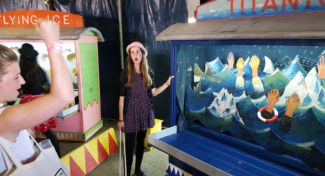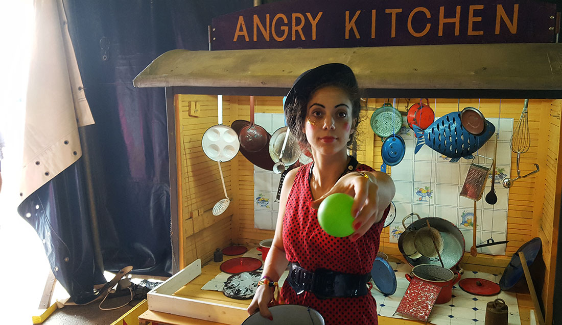 Aber jetzt mal zum ganzen Drumherum! Neben den insgesamt vier Bühnen gab es nämlich noch viel mehr zu entdecken. Ein Highlight war für mich der „Spieler-Zirkus“, in dem man kleine analoge Kirmes-Spielchen (natürlich gratis!) spielen konnte. Manchmal bestand das Ziel dann auch einfach darin, mit Ballwürfen ordentlich Lärm im Land der Pfannen und Töpfe zu fabrizieren…