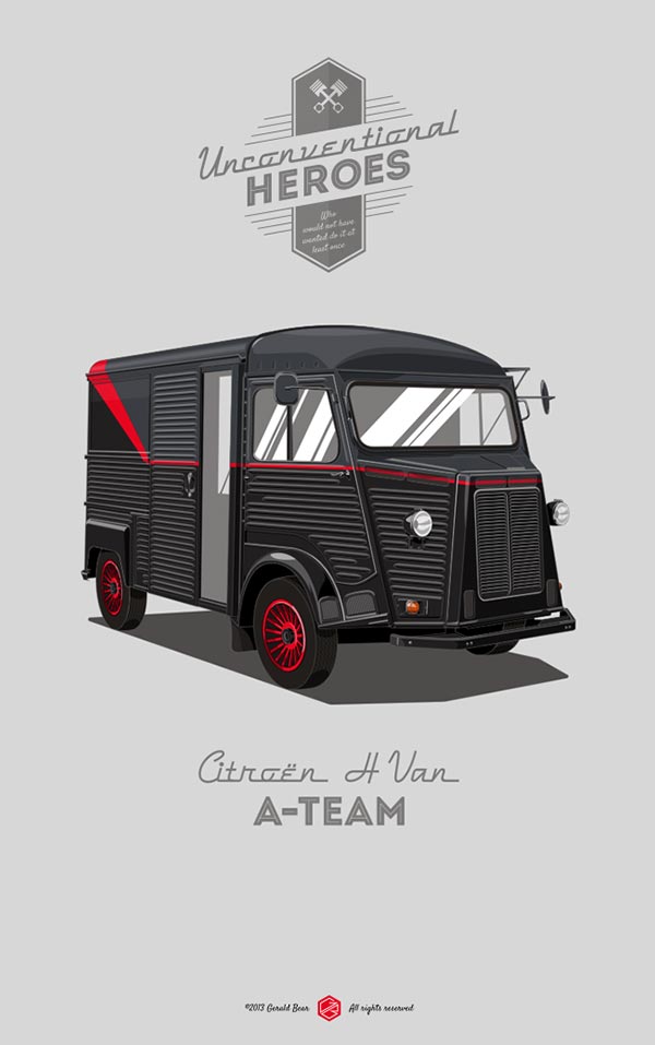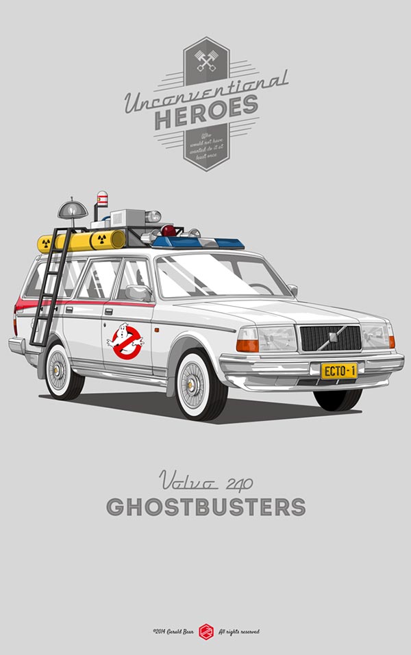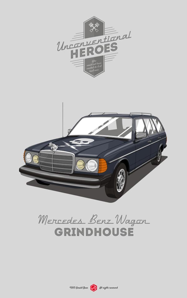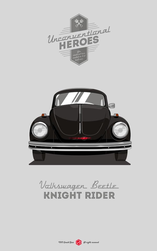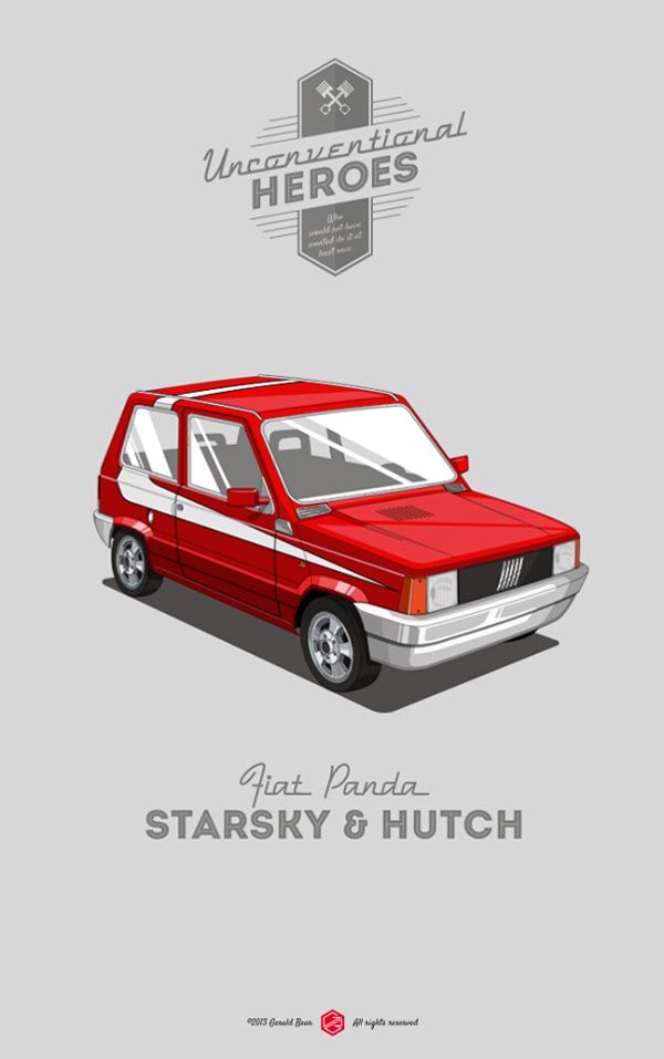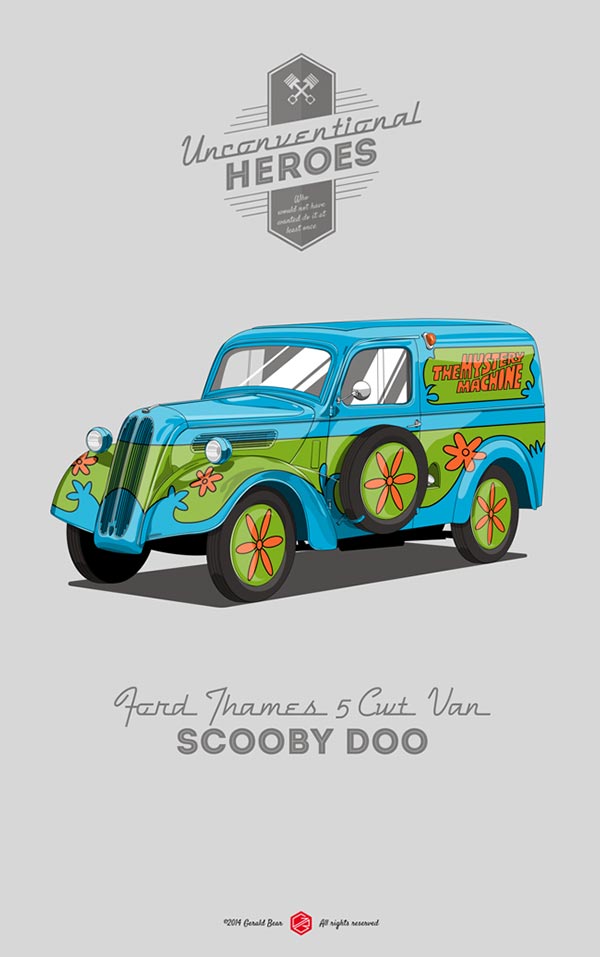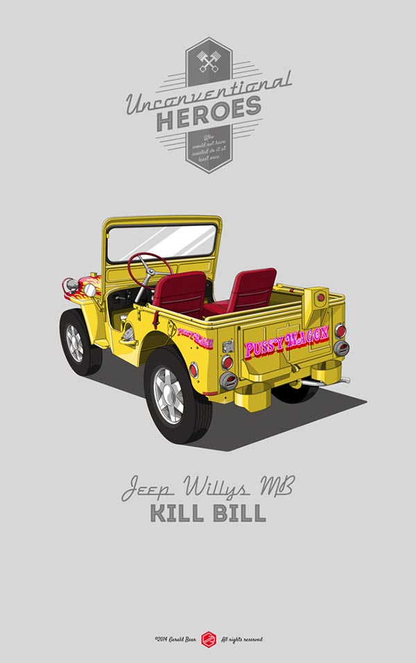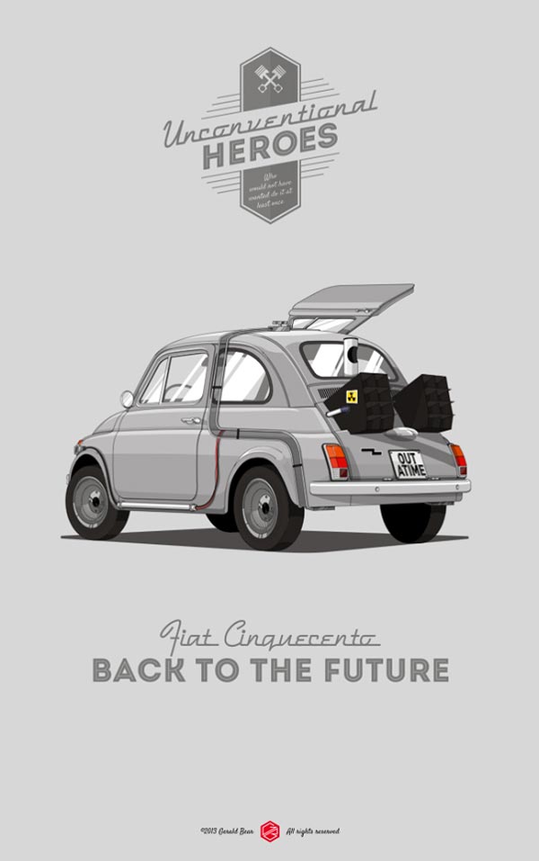 Der Mailänder Illustrator Gerald Bear scheint großer Filmfan zu sein. Anders ist nicht zu erklären, dass der Großteil seiner großartigen Illustrations-Arbeiten eben in jenem Feld angesiedelt sind. Seine aktuelle Reihe Unconventional Heroes zeigt uns ikonische Fahrzeuge der Filmgeschichte, die… nunja… etwas anders sind als sonst. Nämlich irgendwie ganz normal.