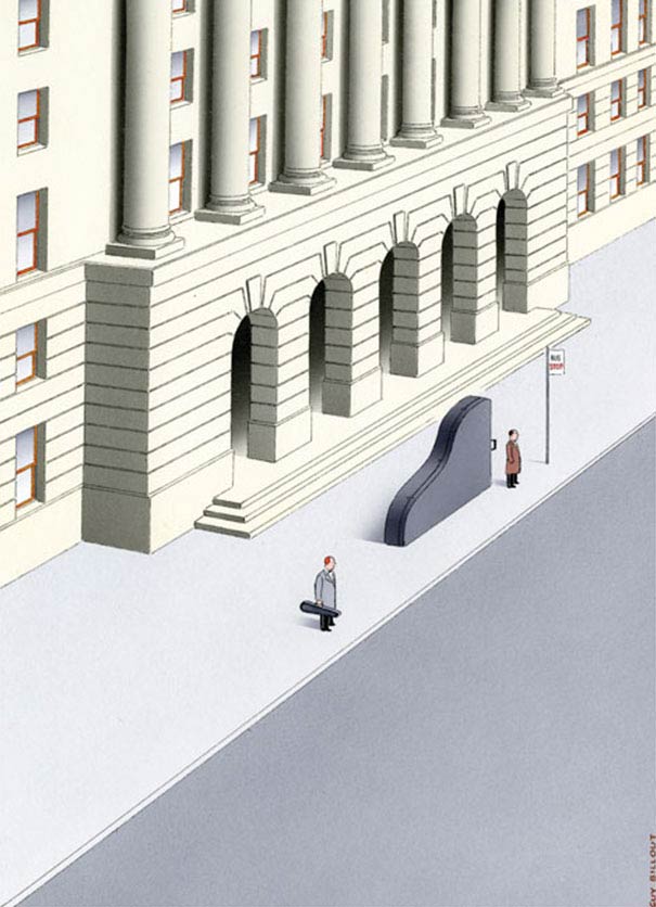 Der französische Künstler Guy Billout spielt gerne mit den Naturgesetzen und setzt sämtliche Logiken außer Kraft. So wird die Erwartungshaltung des Betrachters ad absurdum geführt und spielerisch mit der weltlichen Umwelt gespielt. Hier einige meiner persönlichen Highlights aus seinen surrealen Arbeiten.