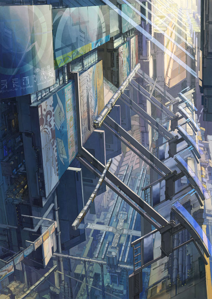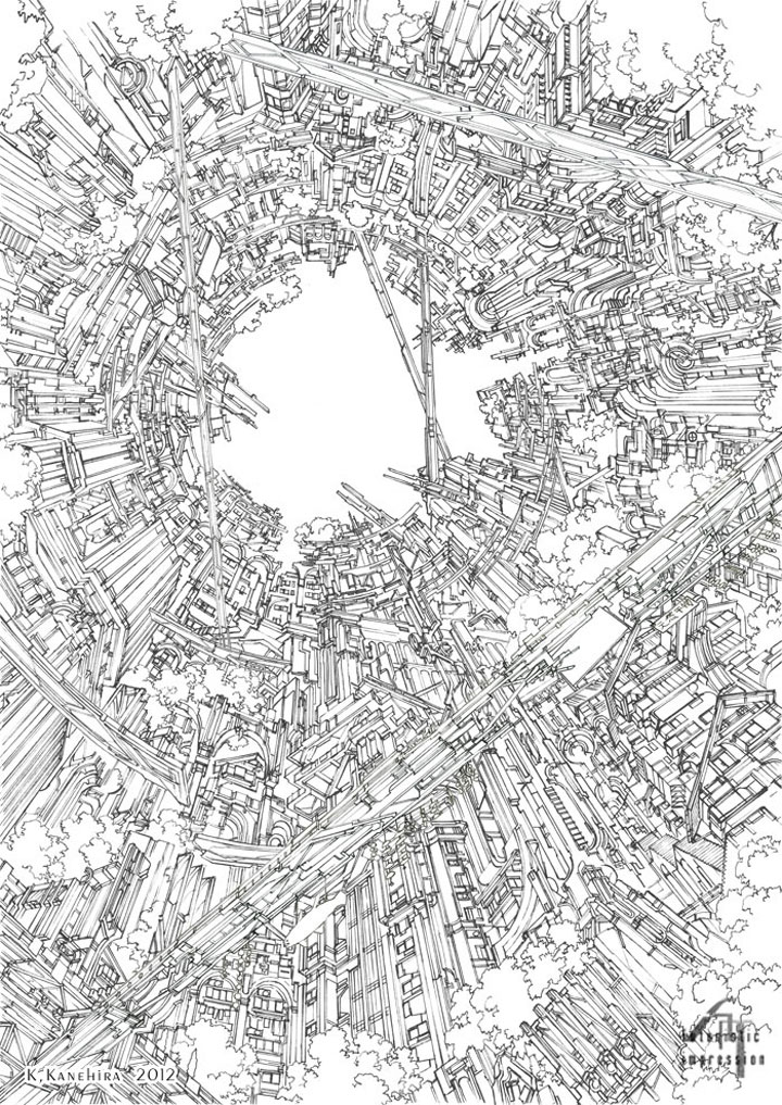 Unglaubelich detaillierte Illustrationen von K. Kanehira aus Osaka. Der Digital Artist zeichnet zunächst digital eine Art Wireframe des spätesten Bildes. Danach färbt er die Flächen in Photoshop aus. Heraus kommen extrem gute Illustrationen, die uns mögliche (architektonische) Landschaften der Zukunft offenbaren.