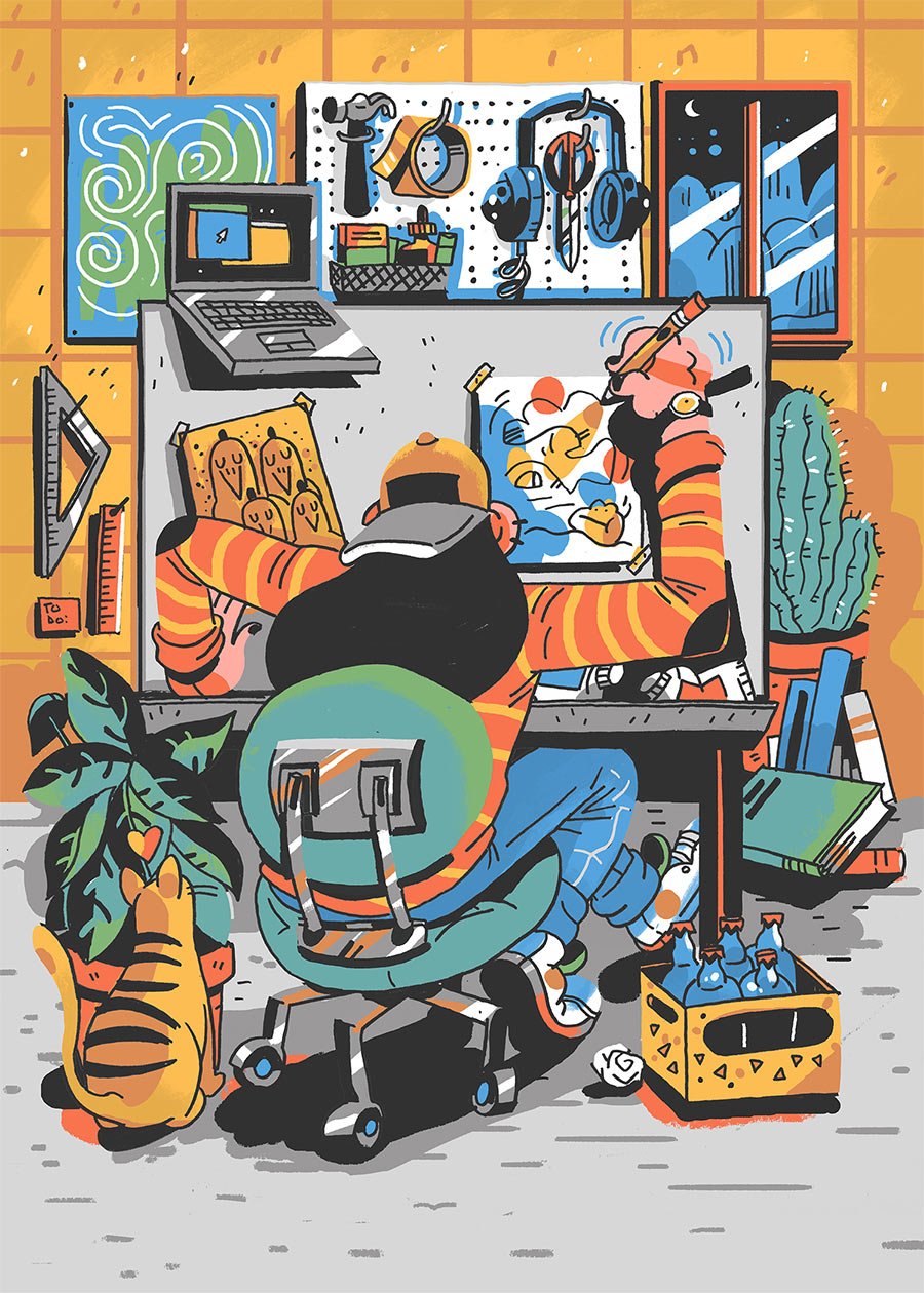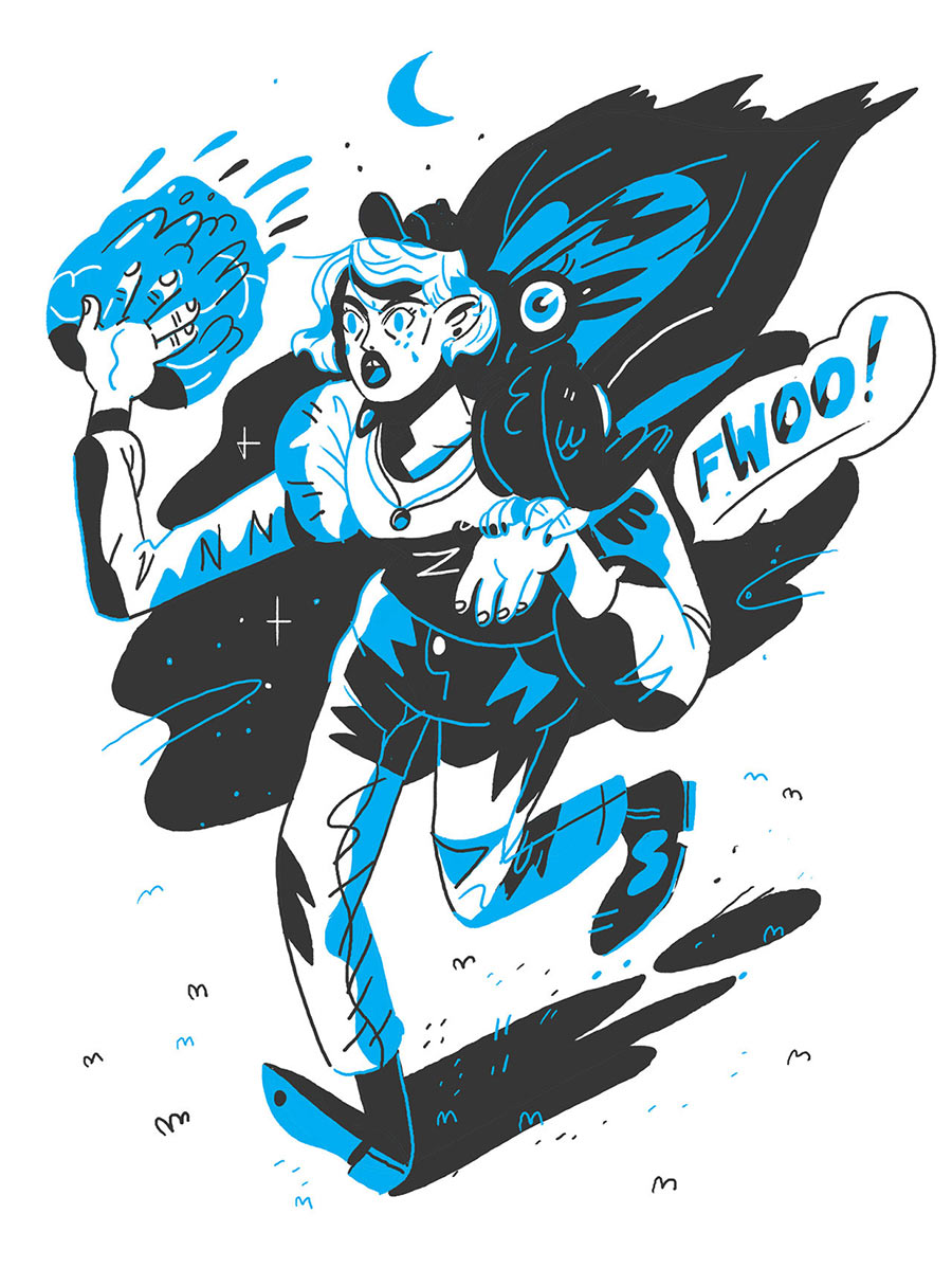 Ich mag den Darstellungsstil der freischaffenden Illustratorin und Comic-Zeichnerin Kelsey Wroten sehr. Die Dame aus Kansas hat einen sehr eigenen Weg, Figuren zu zeichnen, die irgendwie perspektivisch unkorrekt und dadurch doch dynamisch in ihrer Bewegung wirken. Alles sehr cartoony gehalten und doch klar in den Strukturen.