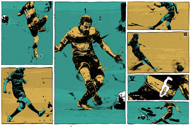 Jedenfalls hat der begabte deutsch-spanische Illustrator ein Gefühl dafür, welche Szenen in den jeweiligen Spielen wichtige Momente waren. Die bildet er dann in comicartigen Illustrationen ab, die in der WM-Sektion von New Republic landen. Wie die sieben Treffer unserer Jungs oben gegen Brasilien. Weitere ikonische WM-Momente dieses Turniers folgen nach dem Sprung.