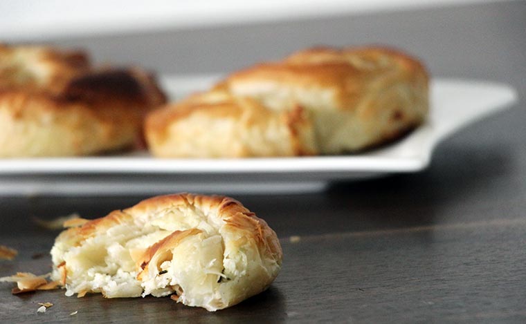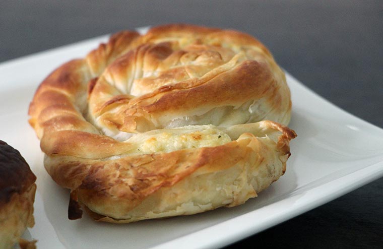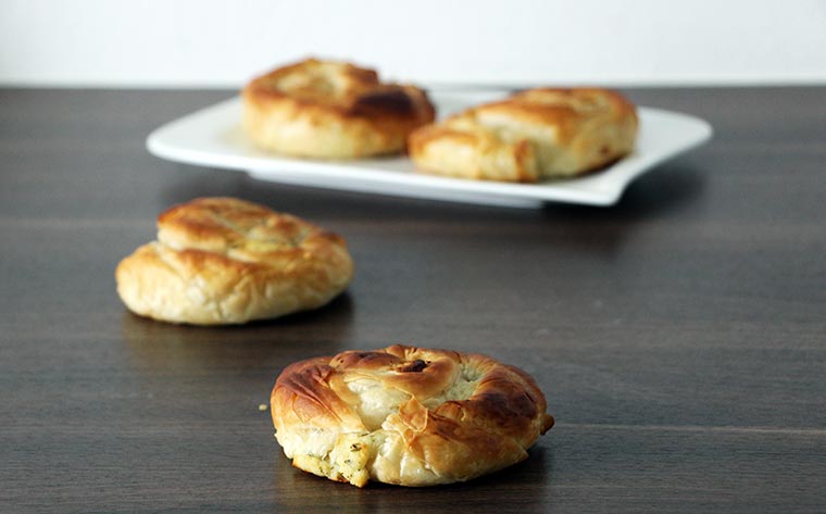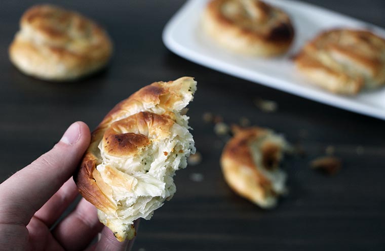 Und ja, die schmecken gut. Ich mag, dass sie außen kross und innen nicht nur beim Käse, sondern auch in Sachen Teig noch cremig-weich sind. Dazu wirkt es nicht nur „über-käsig“, sondern durch die Kräuter erfreulich würzig. Gefällt mir gut. Und gerade richtig warm schmecken sie eben doch um Längen besser als das Börek, das seit vier Stunden in der Bäckerei-Auslage vor sich hin trocknet. Dazu kann man dank der Schneckenform ganz gut Teile abbrechen, auch wenn man die Umgebung dann mit Blätterteig-Spänen zusaut.