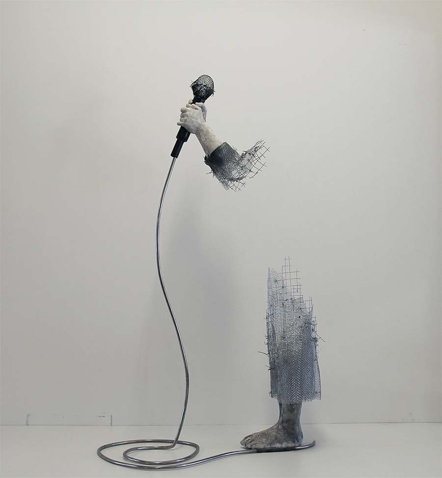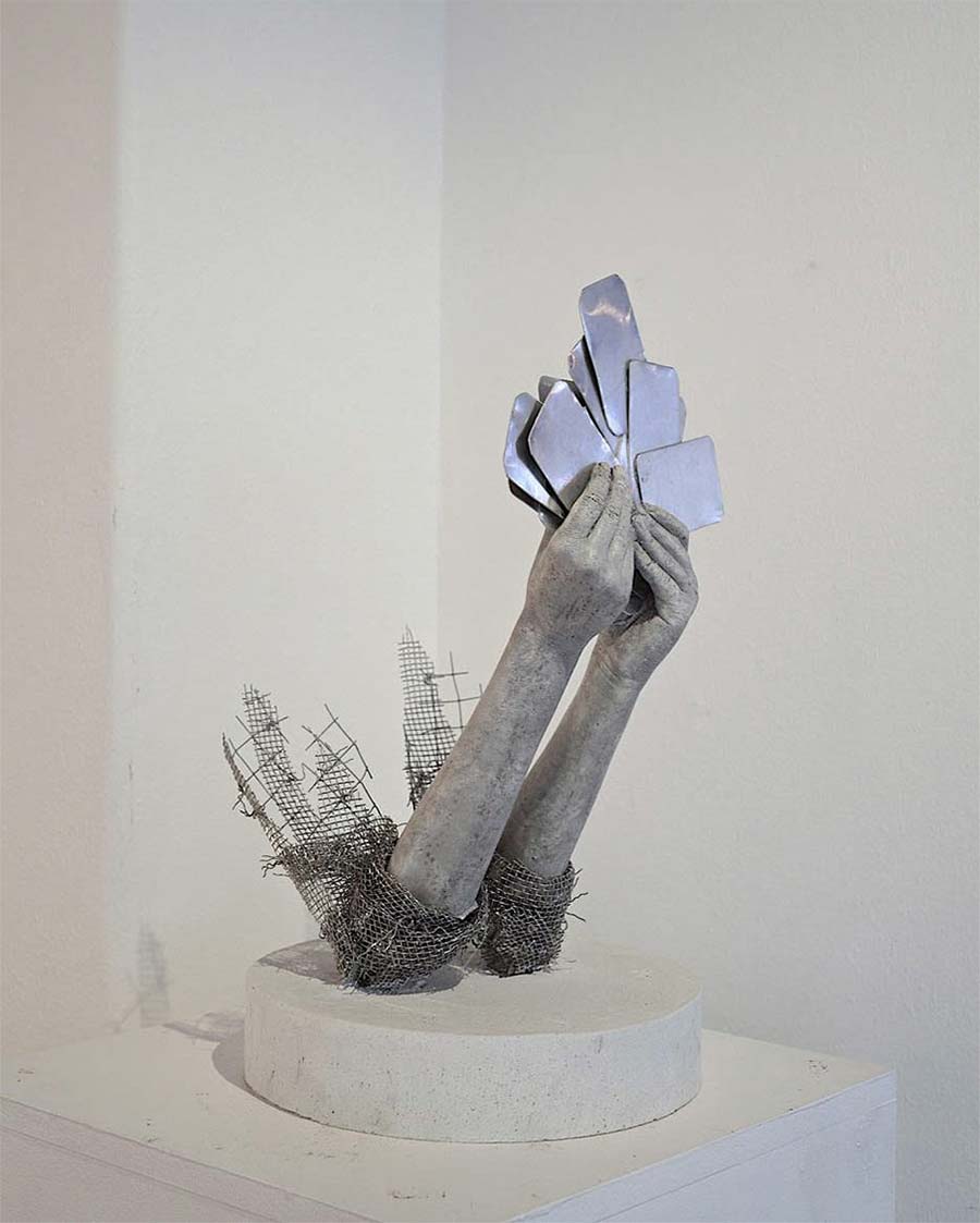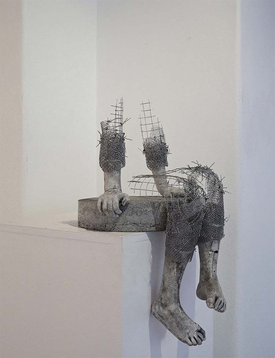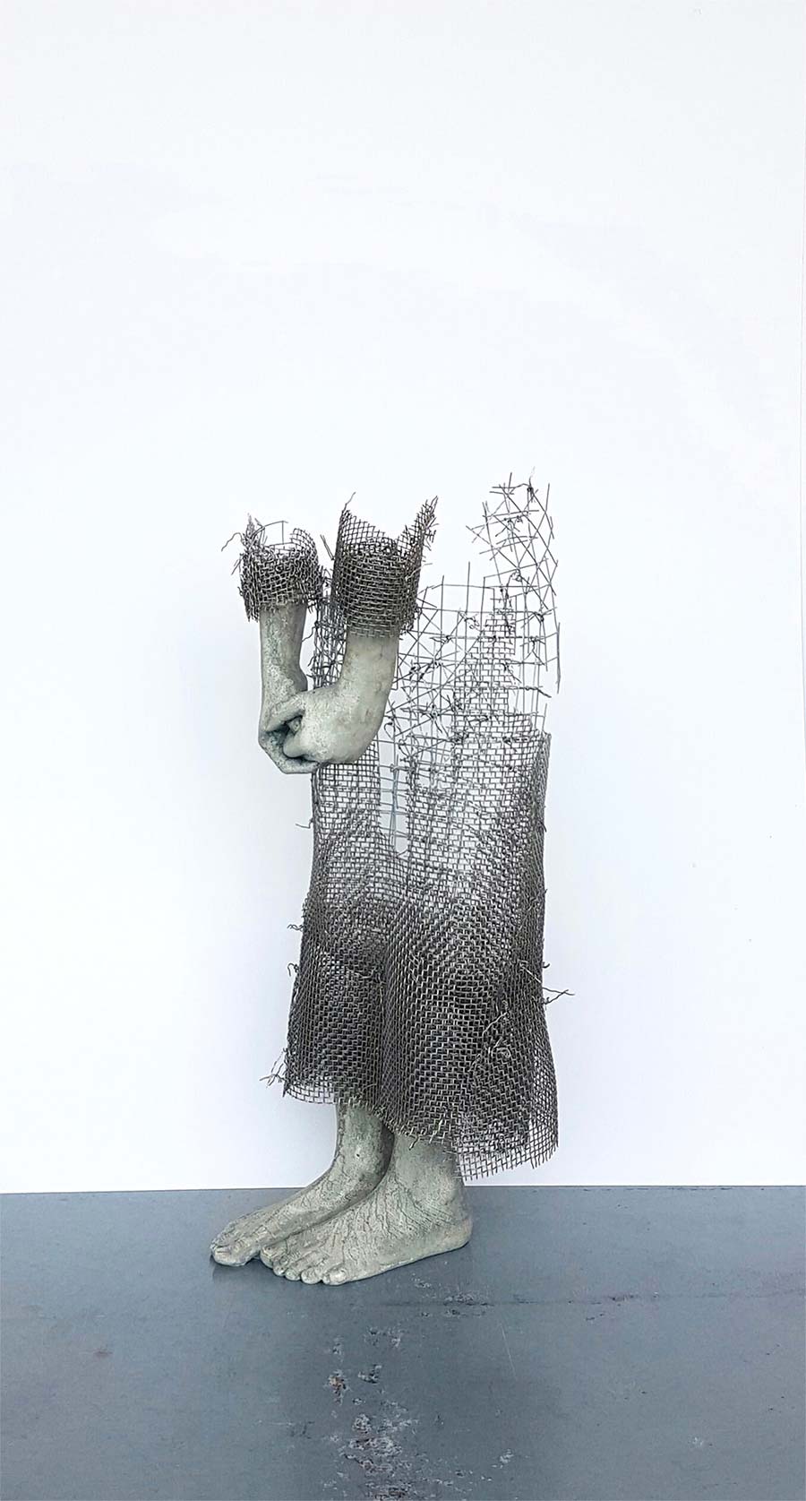 „Lene Kilde creates sculptures inspired by children and their emotions. She finds that children’s body language is their purest form of communication. This is visualized by showing very few body parts, usually only hands and feet, which then are placed in proportion to each other with the use of metal mesh.“