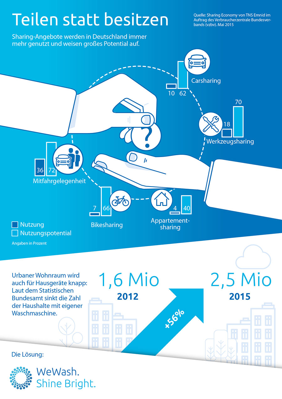 Eigentlich ist es ja eine recht einfache Rechnung – statt sagen wir sechs Wohneinheiten, die jeweils eine Waschmaschine im Keller stehen (und dafür mehrere Hundert Euro ausgegeben haben), genügen doch zwei, die sich alle teilen? Die hat man doch eh nur alle paar Tage (je nach Haushaltsgröße) an, den Rest steht sie nur doof rum und ist schwer. Bei Autos, Fahrrädern, Werkzeugen oder sogar Wohnungen geht das doch auch!