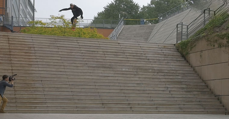 Teufelskerl, Weltrekord und vor allem ein Vorzeige-Durchhaltevermögen. Was Jaws Homoki hier mit dem Brett anstellt, schaut auf den ersten Blick im Ergebnis eben einfach „nur“ wie ein großer, weiter Sprung aus. Aber die Szene, die in etlichen Best ofs und WIN Compilations landen dürfte, hat eben auch eine wunderbare Vorgeschichte. Uns wird nämlich nicht nur der geglückte Stunt gezeigt, sondern auch all das Herzzerreißende davor. Platzverbot, zerstörtertes Material und viele, viele, viele Stürze und Fehlversuche. Doch dann schafft es Homoki, das als unmachbar betitelte 25er Treppenset in Lyon zu bezwingen – und macht sich damit unsterblich. Hut ab!