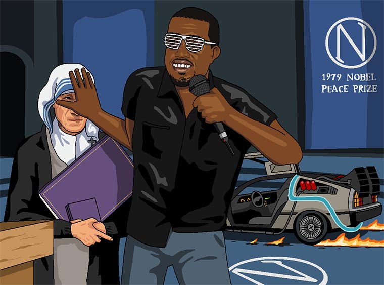 „Kanye West travels back in time in a DeLorean to ruin Mother Teresa’s Nobel Peace Prize acceptance speech“