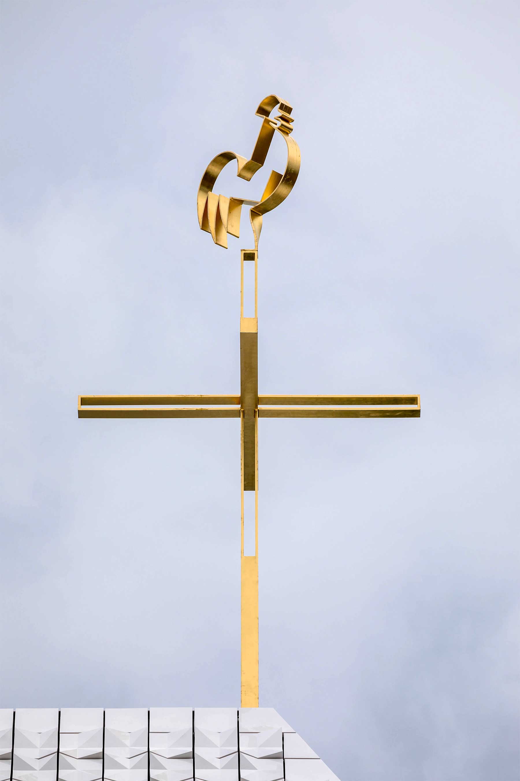 Die größte Erkenntnis dieses Beitrages dürfte sein, dass es doch tatsächlich einen süddeutschen Ort mit dem wunderschönen Namen „Poing“ gibt. Herrlich! Abseits dessen (also inhaltlich, geografisch ist es recht un-abseits, da direkt dort) befindet sich seit letztem Jahr das neu erbaute „Kirchenzentrum Seliger Pater Rupert Mayer“. Konzipiert wurde das eindrucksvolle Gebäude von Merck Architekten. Mir gefällt dabei der saubere und minimalistische Ansatz. Alleine schon dieser modern gestaltete Dach-Hahn ist eine Augenweide! Aber auch die bekachelte Außenfassade macht einiges her, wie ich finde.