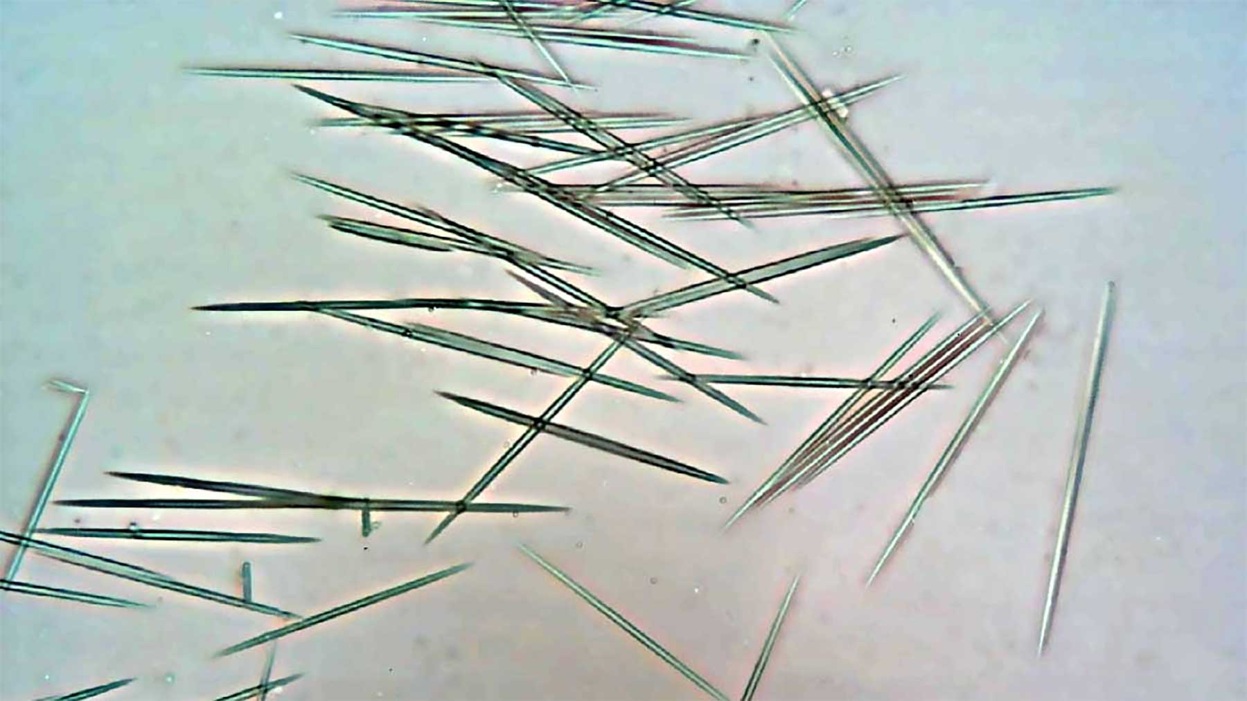Hier zwei kurze Videos, die das genauer erklären und weitere mikroskopische Aufnahmen der Raphiden in der Ananasfrucht zeigen (sowie ein bisschen mehr Grunderläuterung in der Videobeschreibung auf YouTube):