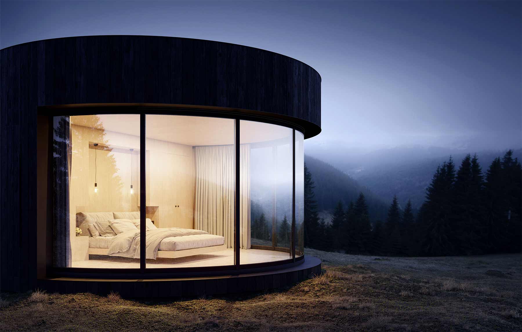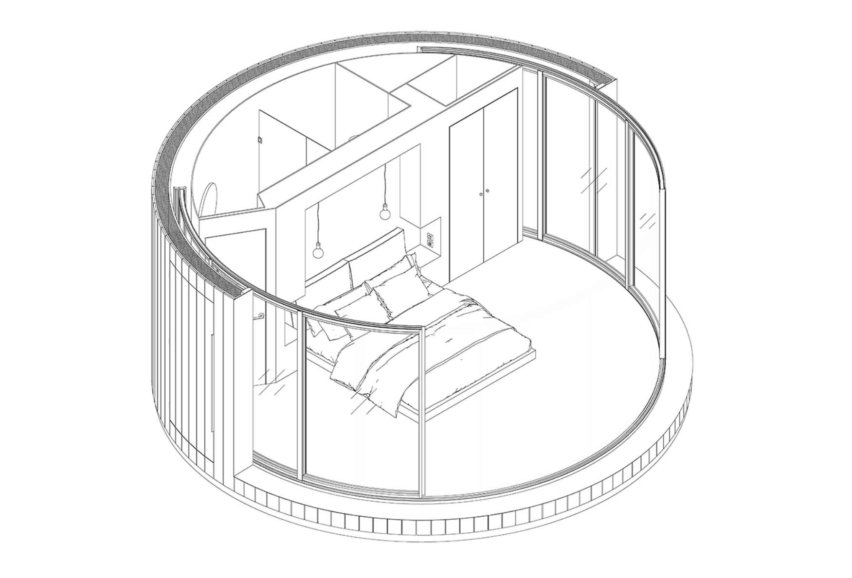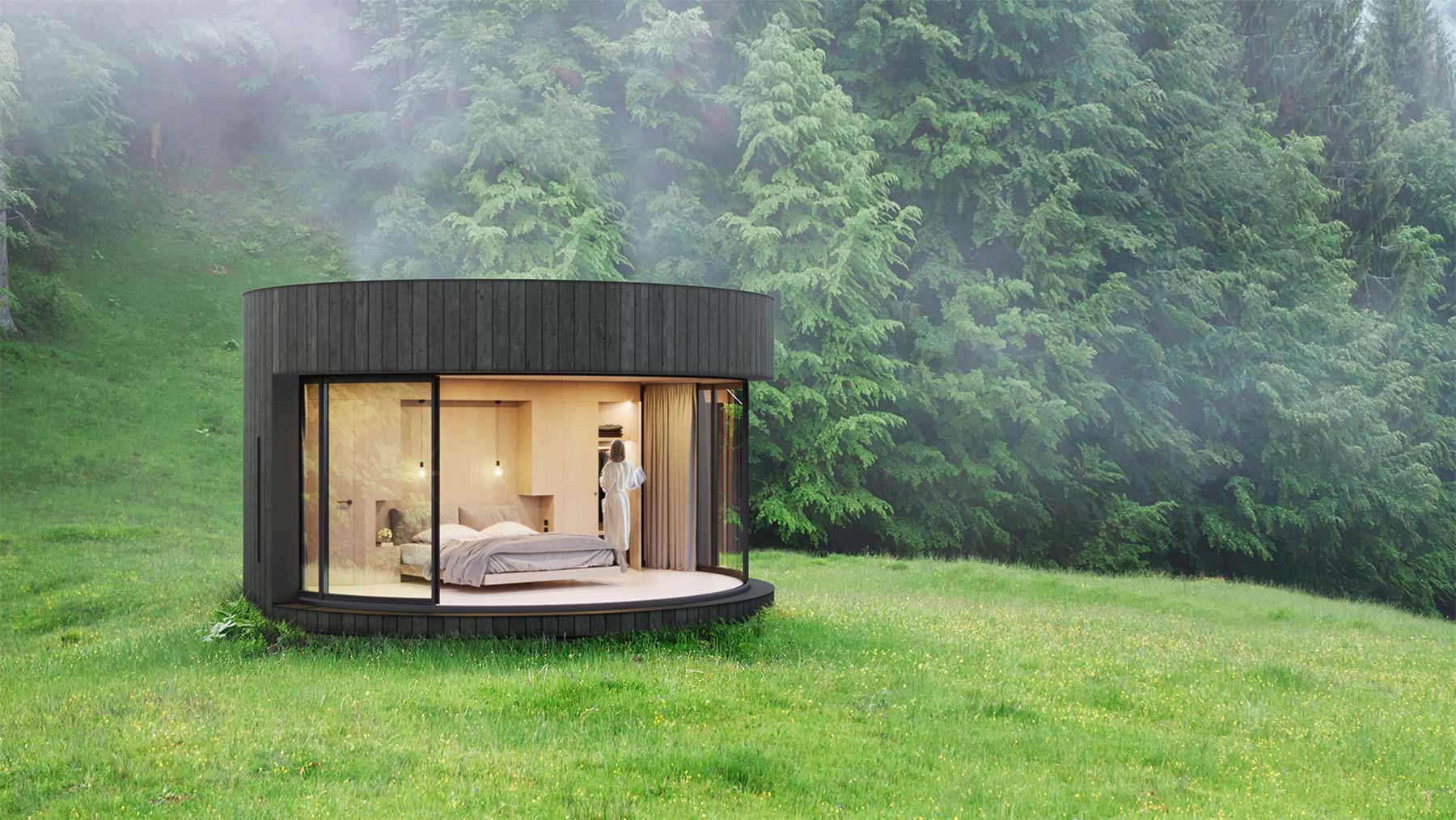 Minimalistisch wohnen ist ja absolut im Trend. Weniger ist mehr – auch, weil „mehr“ meist mehr kostet. Eine sehr schick gestaltete Version des Tiny Homes ist das „LUMIPOD“. Das französische Architekturbüro Lumicene hat das gerademal 18 Quadratmeter große Rund entwickelt, das vermutlich eher ein kleines Ferien-Domizil für einen Kurzaufenthalt, denn ein wirklich fester Erstwohnsitz sein dürfte. Aber wer auf Abgeschiedenheit und einen längeren Moment inmitten der Natur steht, ist hier genau richtig aufgehoben. Ein modernes Innendesign sowie Bett mit Aussicht und ansprechender Bad-Gestaltung sind inbegriffen. Und ja, es gibt Vorhänge und man kann sogar die runde Glasfront komplett öffnen, um „eins“ mit der Natur zu werden.
